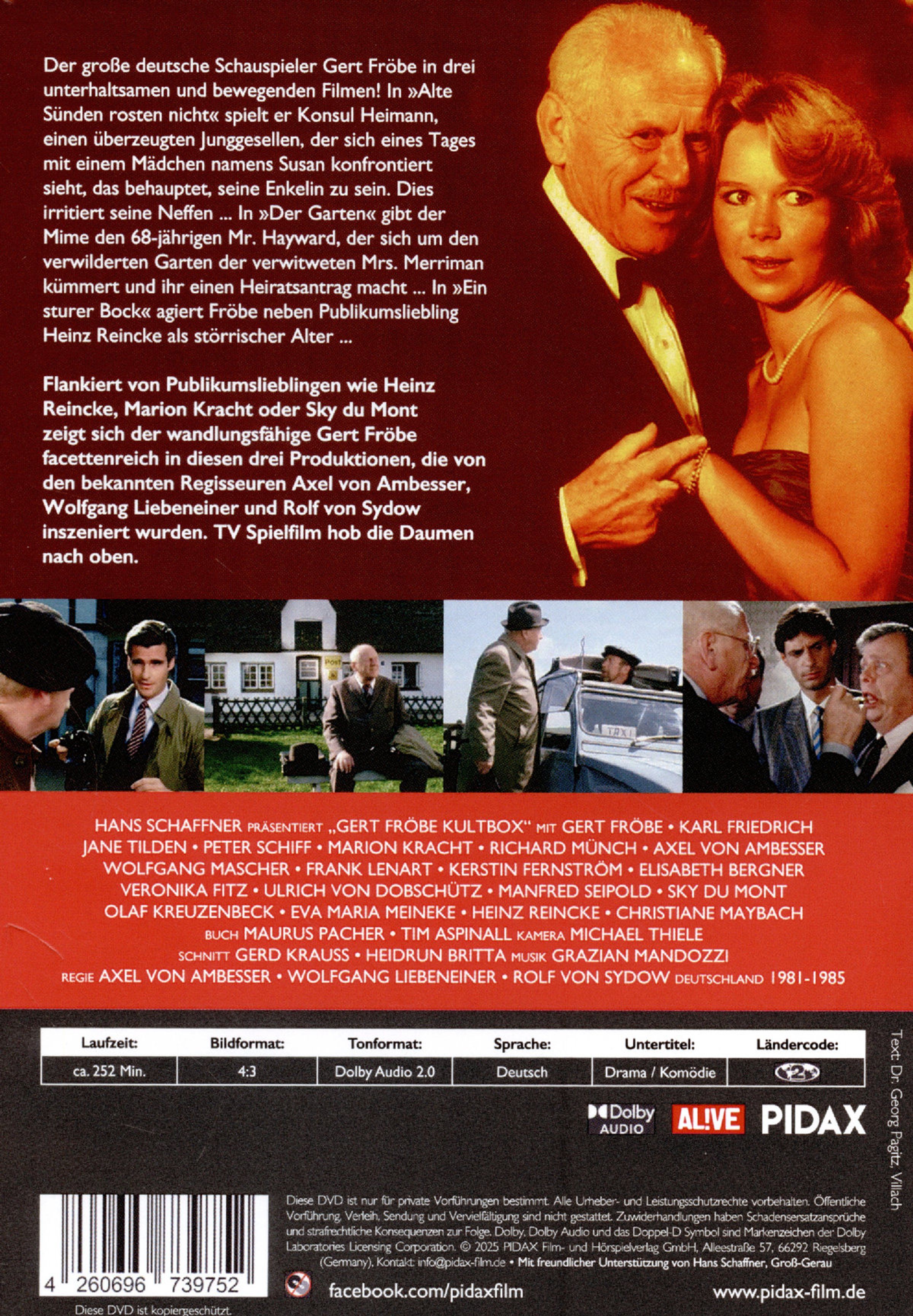 Der große deutsche Schauspieler Gert Fröbe in drei unterhaltsamen und bewegenden Filmen! In »Alte Sünden rosten nicht« spielt er Konsul Heimann, einen überzeugten Junggesellen, der sich eines Tages mit einem Mädchen namens Susan konfrontiert sieht, das behauptet, seine Enkelin zu sein. Dies irritiert seine Neffen ... In »Der Garten« gibt der Mime den 68-jährigen Mr. Hayward, der sich um den verwilderten Garten der verwitweten Mrs. Merriman kümmert und ihr einen Heiratsantrag macht ... In »Ein sturer Bock« agiert Fröbe neben Publikumsliebling Heinz Reincke als störrischer Alter ...