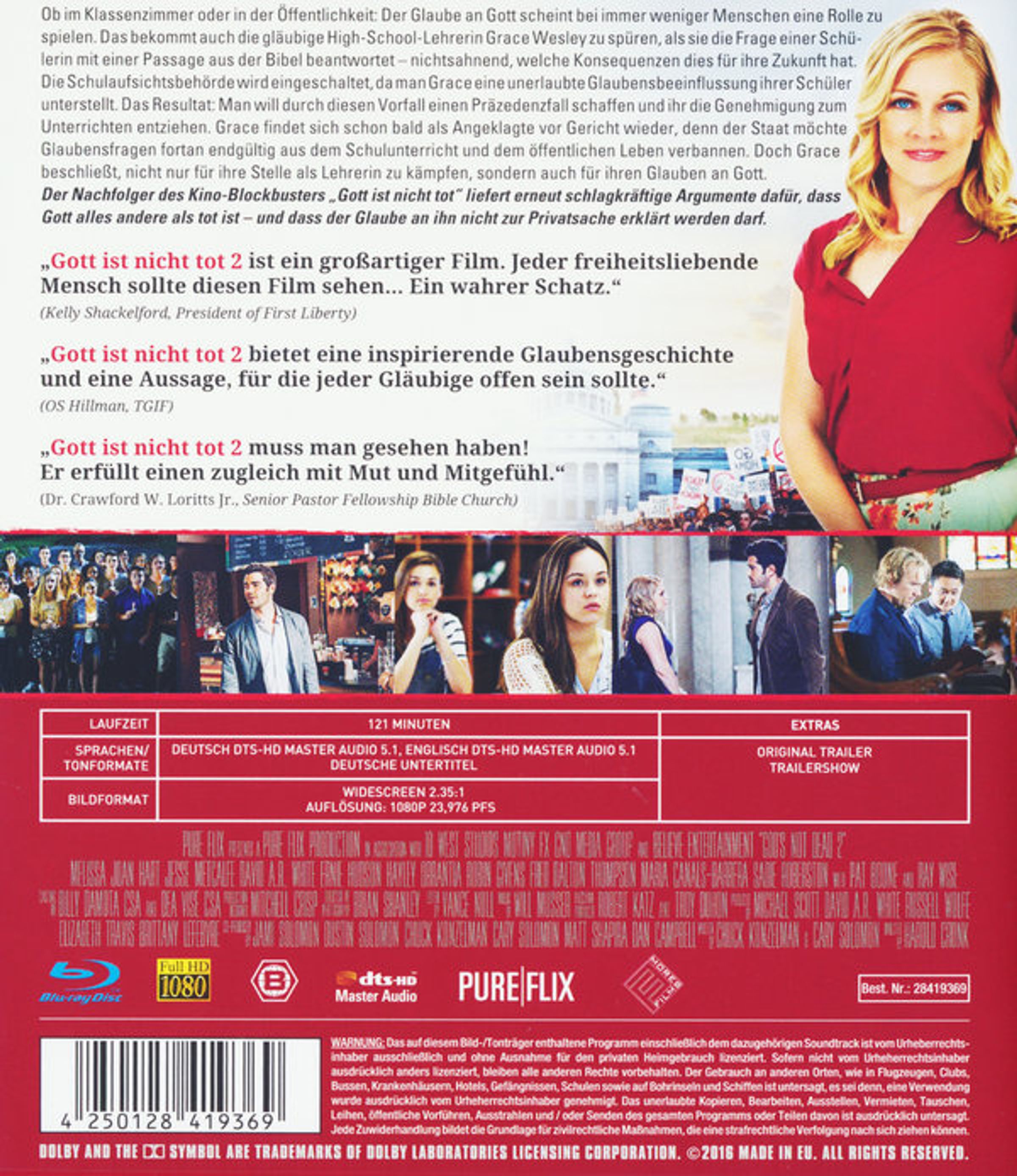 »Gott ist nicht tot 2 ist ein großartiger Film. Jeder freiheitsliebende Mensch sollte diesen Film sehen... Er ist ein wahrer Schatz.« (Kelly Shackelford, President of First Liberty)»Gott ist nicht tot 2 muss man gesehen haben! Er erfüllt einen zugleich mit Mut und Mitgefühl.« (Dr. Crawford W. Loritts Jr., Senior Pastor Fellowship Bible Church)
