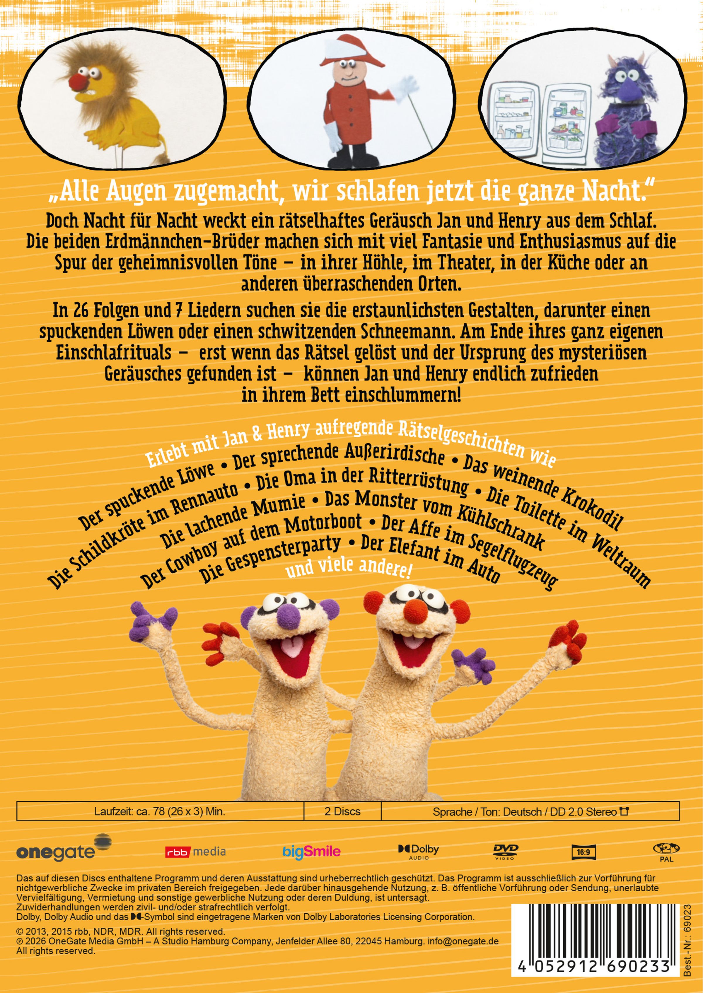 In 26 Folgen und 7 Liedern suchen sie die erstaunlichsten Gestalten, darunter einen spuckenden Löwen oder einen schwitzenden Schneemann. Am Ende ihres ganz eigenen Einschlafrituals – erst wenn das Rätsel gelöst und der Ursprung des mysteriösen Geräusches gefunden ist – können Jan und Henry endlich zufrieden in ihrem Bett einschlummern!