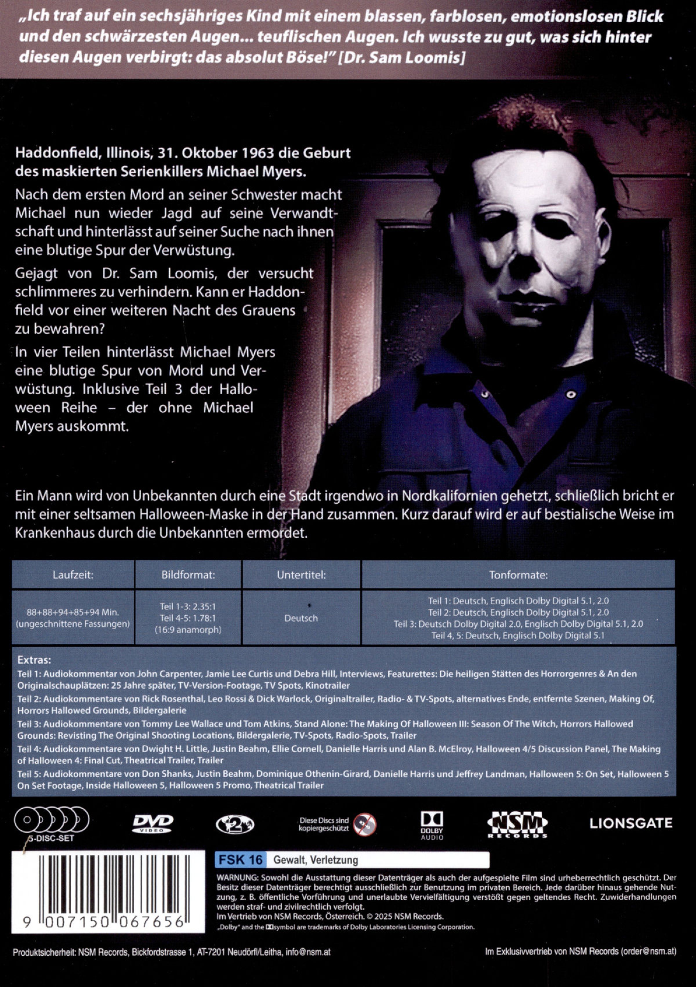 In 4 Teilen hinterlässt Michale Myers eine blutige Spur von Mord und Verwüstung. Inklusive Teil 3 der Halloween Reihe - der ohne Michael Myers auskommt. Ein Mann wird von Unbekannten durch eine Stadt irgendwo in Nordkalifornien gehetzt, schließlich bricht er mit einer seltsamen Halloween Maske in der Hand zusammen. Kurz darauf wird er auf bestialische Weise im Krankenhaus durch die Unbekannten ermordet.