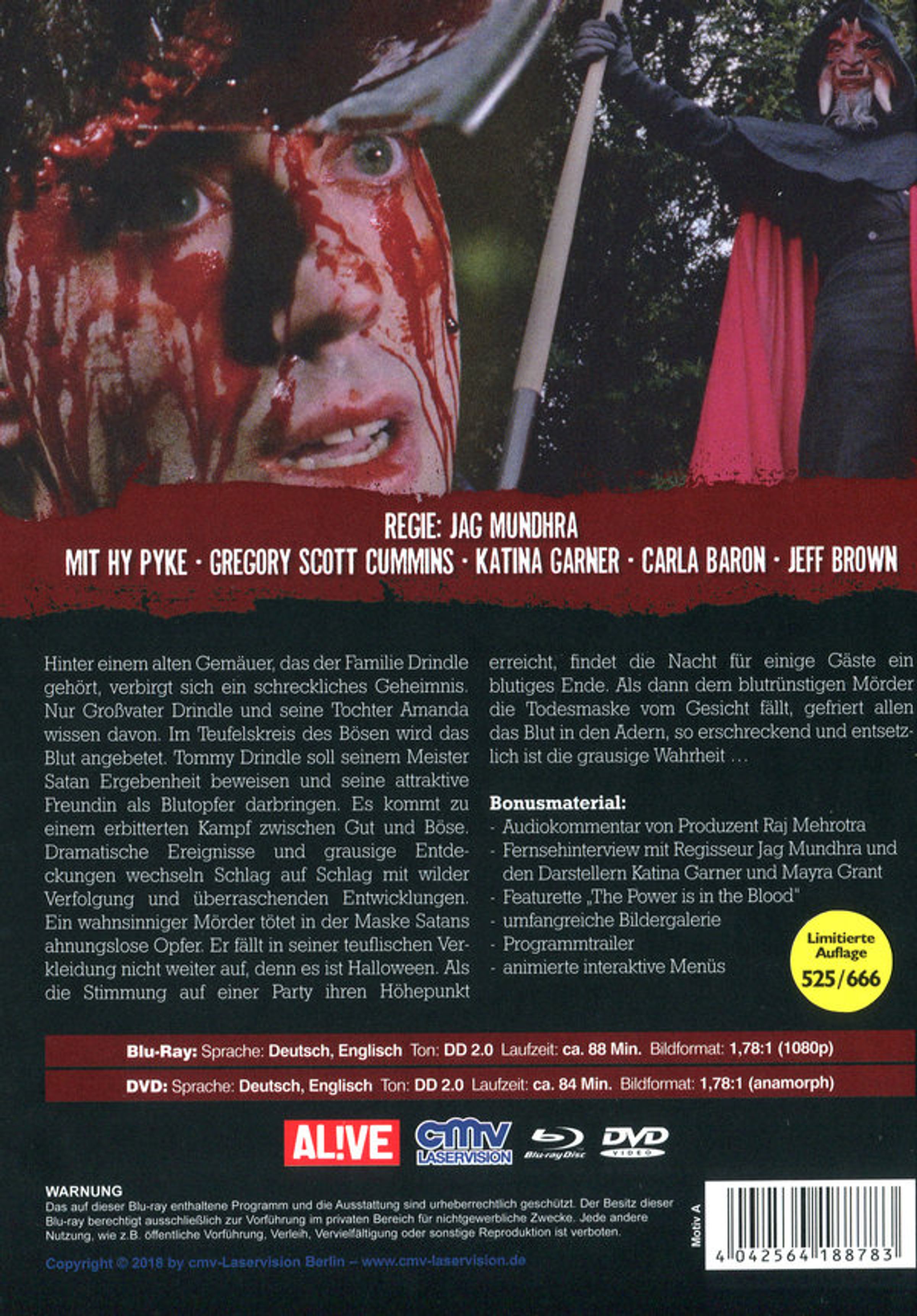 Hinter einem alten Gemäuer, das der Familie Drindle gehört, verbirgt sich ein schreckliches Geheimnis. Nur Großvater Drindle und seine Tochter Amanda wissen davon. Im Teufelskreis des Bösen wird das Blut angebetet. Tommy Drindle soll seinem Meister Satan Ergebenheit beweisen und seine attraktive Freundin als Blutopfer darbringen. Es kommt zu einem erbitterten Kampf zwischen Gut und Böse. Dramatische Ereignisse und grausige Entdeckungen wechseln Schlag auf Schlag mit wilder Verfolgung und überraschenden Entwicklungen. Ein wahnsinniger Mörder tötet in der Maske Satans ahnungslose Opfer. Er fällt in seiner teuflischen Verkleidung nicht weiter auf, denn es ist Halloween. Als die Stimmung auf einer Party ihren Höhepunkt erreicht, findet die Nacht für einige Gäste ein blutiges Ende. Als dann dem blutrünstigen Mörder die Todesmaske vom Gesicht fällt, gefriert allen das Blut in den Adern, so erschreckend und entsetzlich ist die grausige Wahrheit...