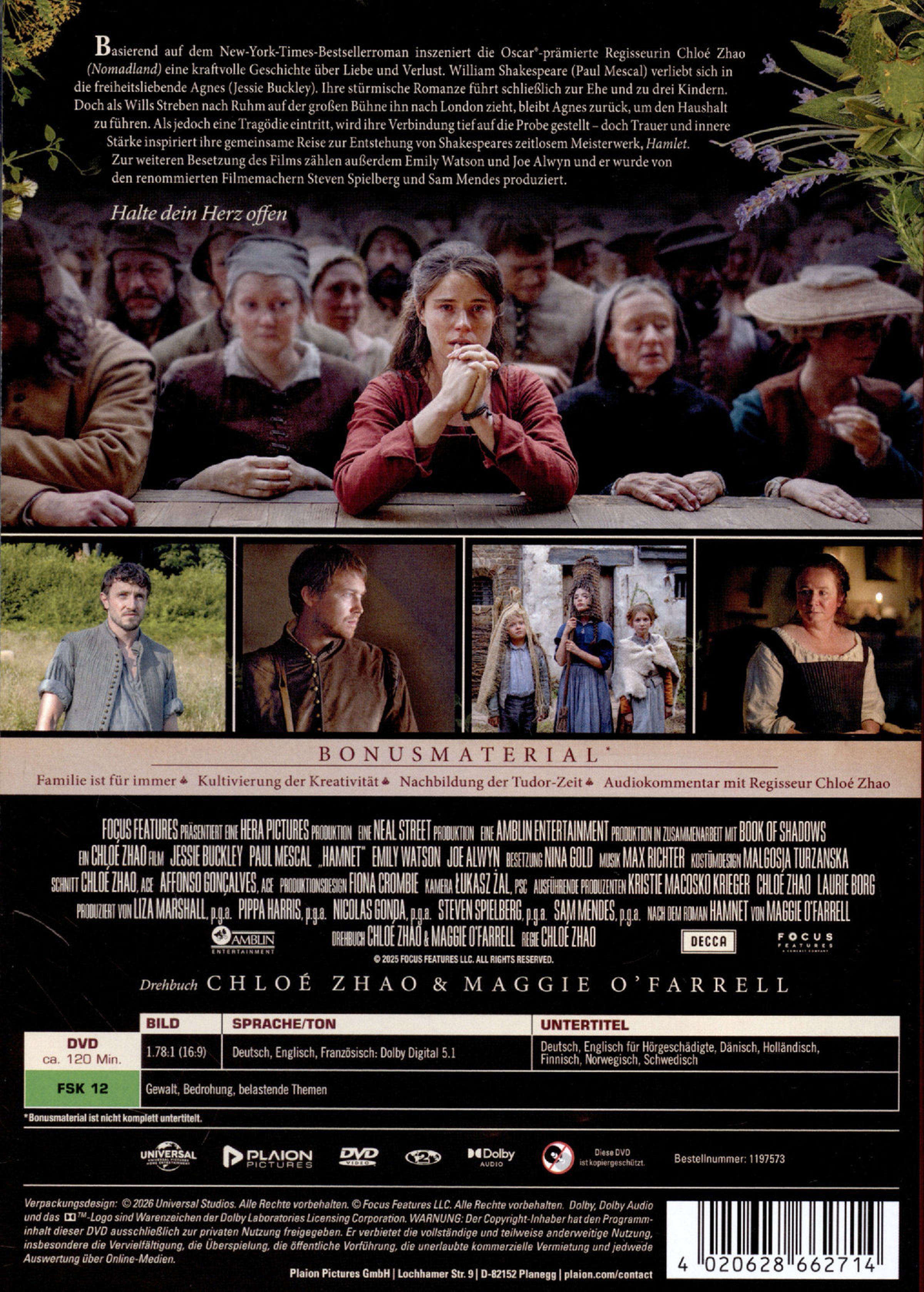 Mit HAMNET kehrt Oscar®-Gewinnerin Chloé Zhao auf die große Leinwand zurück. In der Verfilmung des gefeierten Romans von Maggie O'Farrell, die gemeinsam mit Zhao auch das Drehbuch verfasste, wird die Geschichte von William Shakespeares Familie erzählt. Aus Sicht seiner empfindsamen Frau Agnes erlebt man, wie sie sich in den großen Barden verliebt und die beiden ein gemeinsames Leben planen. Als ihr einziger Sohn Hamnet im Alter von elf Jahren durch die Pest ums Leben kommt, droht ihre große Liebe zu ersticken. Mitten in dieser furchtbaren persönlichen Tragödie beginnt Shakespeare in tiefer Verzweiflung und Trauer, »Hamlet« zu schreiben, eines der großen Dramen der Literaturgeschichte.