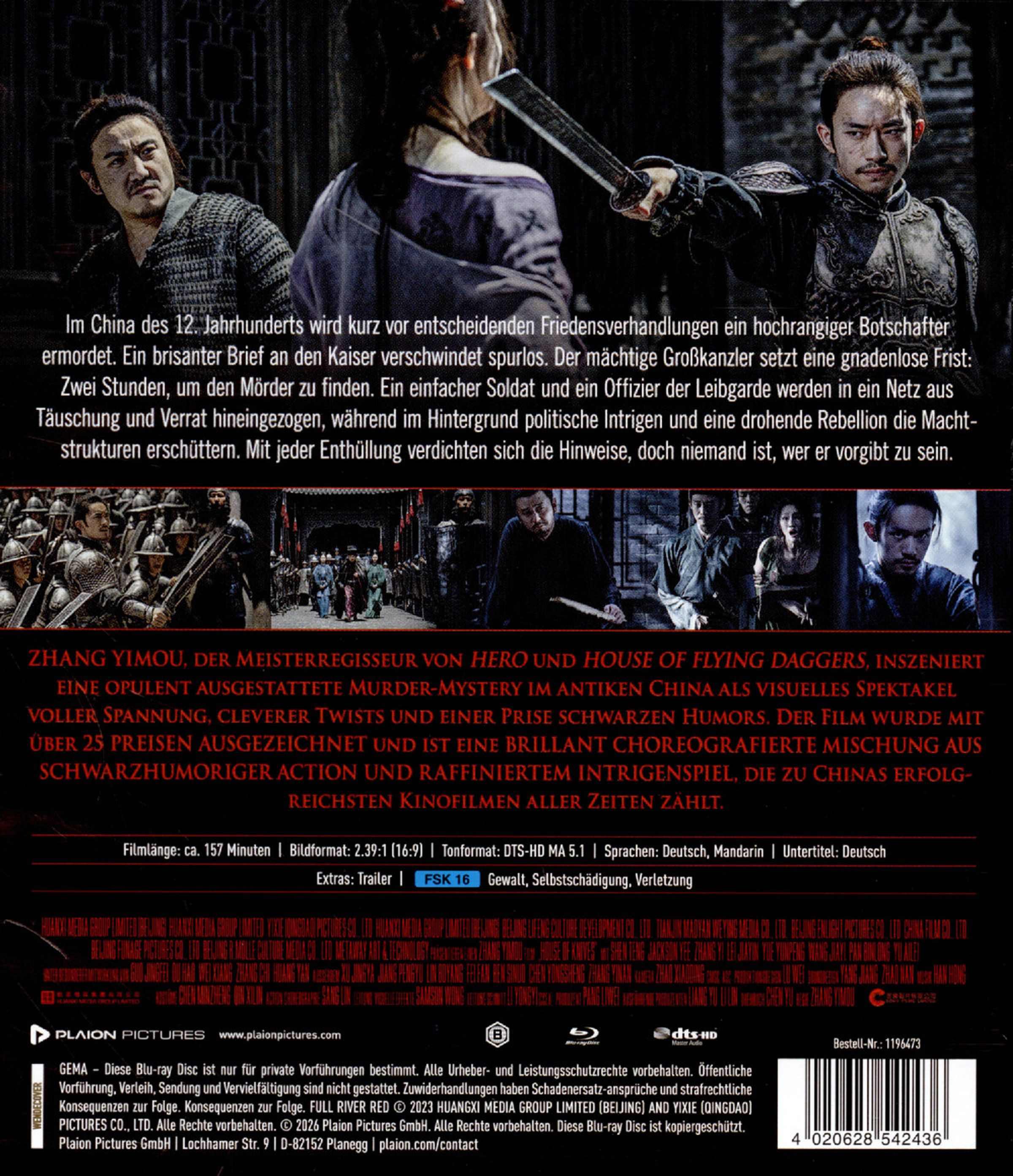 DVD-Hülle: "House of Knives" in roten Großbuchstaben. Zwei Personen mit Schwertern in intensivem Blickduell. FSK 16., Blu-ray Disc