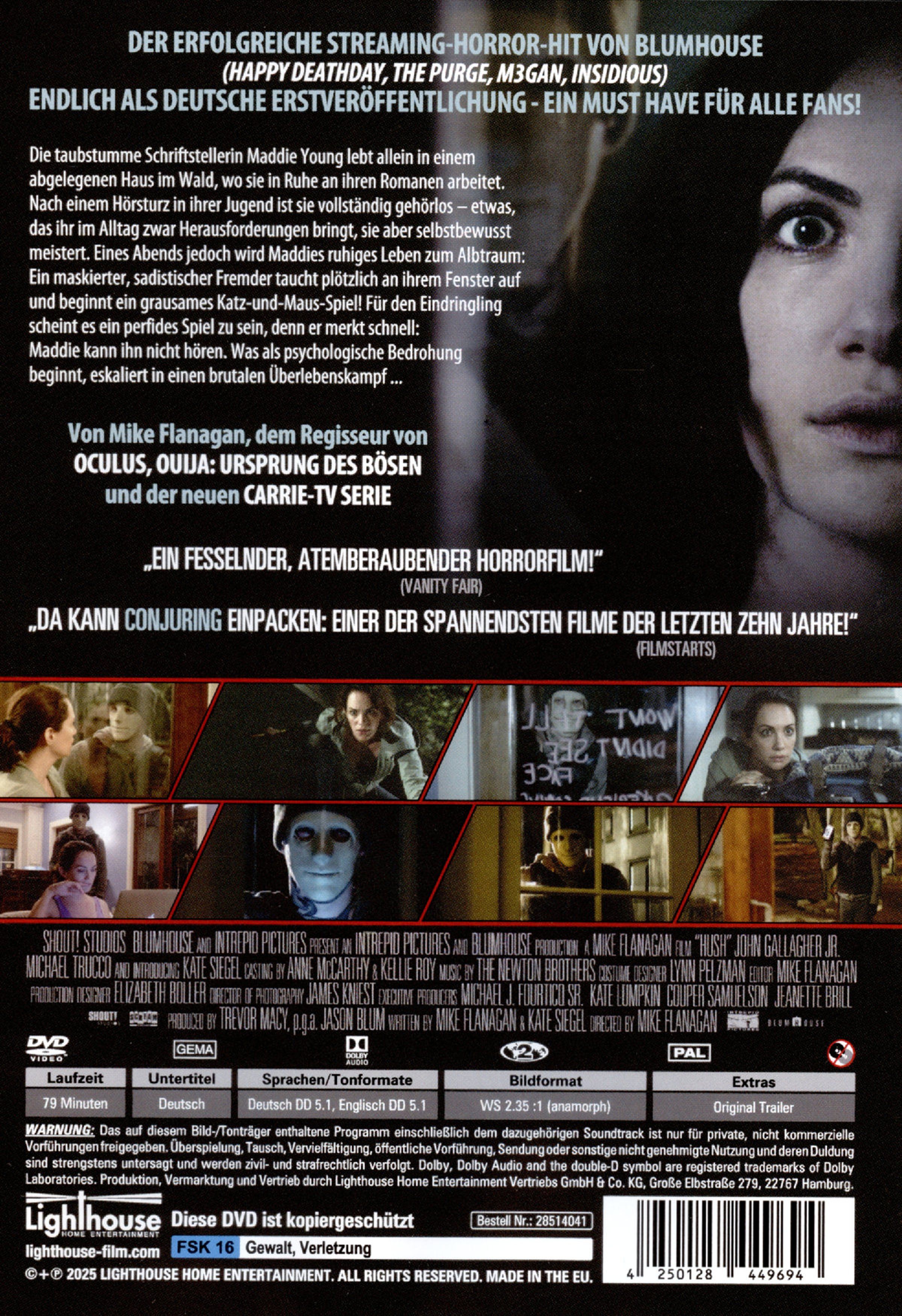 Die taubstumme Autorin Maddie lebt isoliert im Wald, wo sie in Ruhe an ihren Romanen arbeitet - bis plötzlich ein maskierter Fremder auftaucht. Er beobachtet sie, spielt mit ihr. Denn er weiß: Sie kann ihn nicht hören. Aus stiller Bedrohung wird blanker Horror! Eingesperrt, ohne Hilfe - und der Killer beginnt sein grausames Katz-und-Maus-Spiel ...