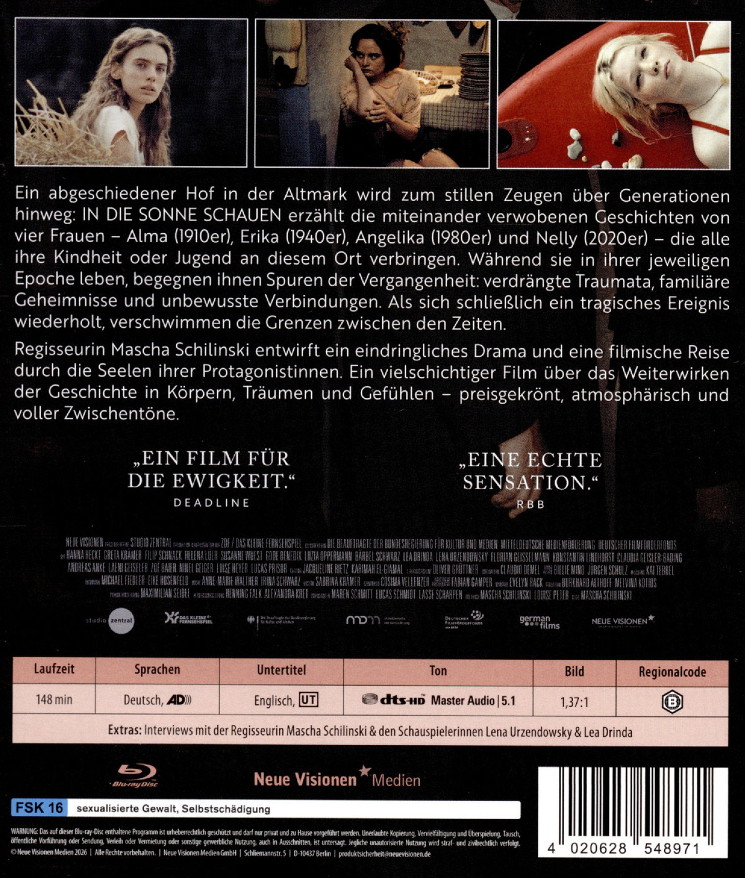 Ein abgeschiedener Hof in der Altmark wird zum stillen Zeugen über Generationen hinweg: IN DIE SONNE SCHAUEN erzählt die miteinander verwobenen Geschichten von vier Frauen - Alma (1910er), Erika (1940er), Angelika (1980er) und Nelly (2020er) - die alle ihre Kindheit oder Jugend an diesem Ort verbringen. Während sie in ihrer jeweiligen Epoche leben, begegnen ihnen Spuren der Vergangenheit: verdrängte Traumata, familiäre Geheimnisse und unbewusste Verbindungen. Als sich schließlich ein tragisches Ereignis wiederholt, verschwimmen die Grenzen zwischen den Zeiten.