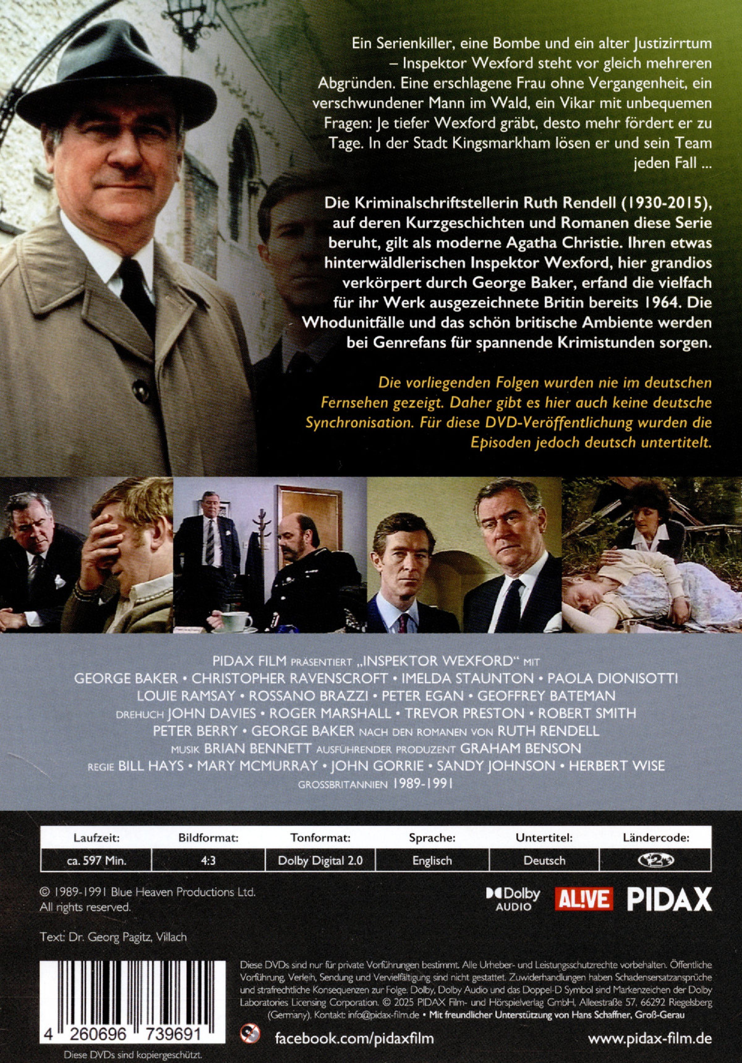 Die Kriminalschriftstellerin Ruth Rendell (1930-2015), auf deren Kurzgeschichten und Romanen diese Serie beruht, gilt als moderne Agatha Christie. Ihren etwas hinterwäldlerischen Inspektor Wexford, hier grandios verkörpert durch George Baker, erfand die vielfach für ihr Werk ausgezeichnete Britin bereits 1964. Die Serie wurde nur einmal vor über 20 Jahren in Deutschland ausgestrahlt. Die Whodunitfälle und das schön britische Ambiente werden bei Genrefans für spannende Krimistunden sorgen.