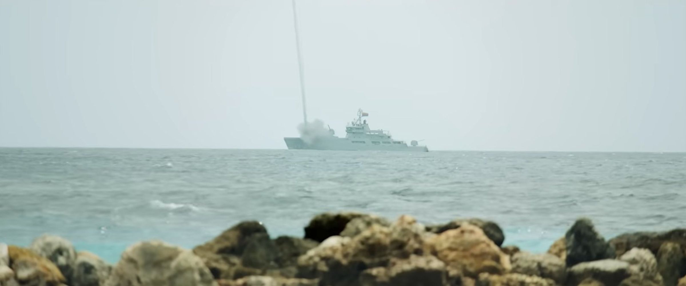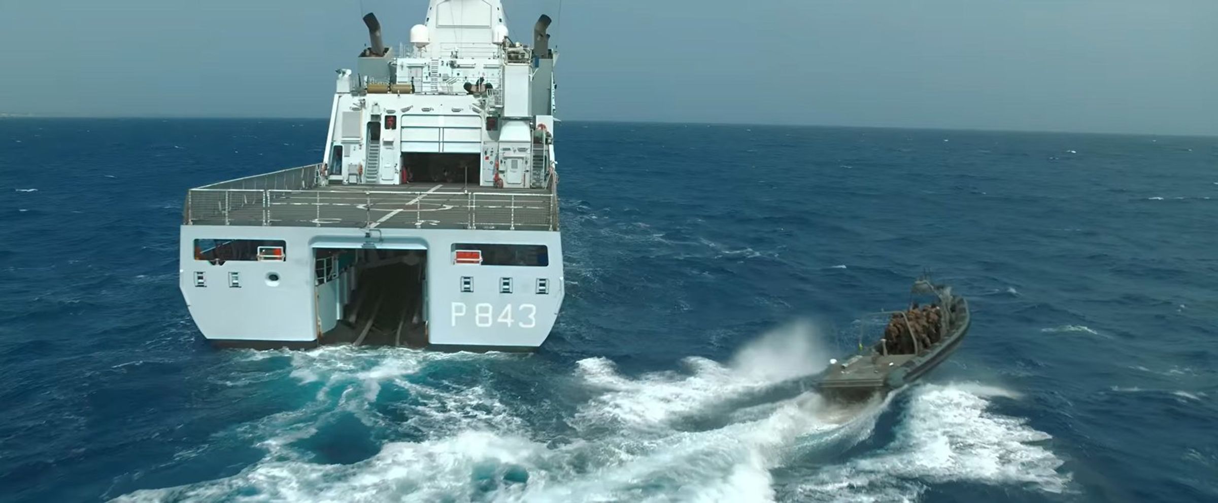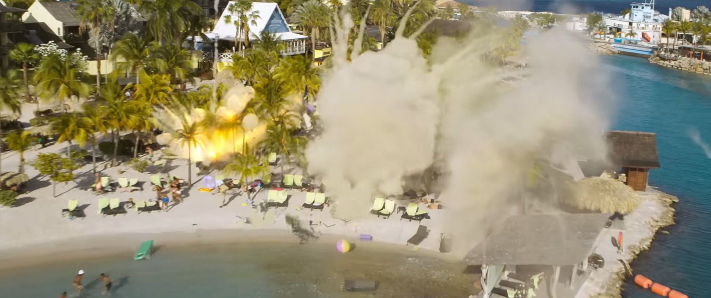 „INVASION: ZWISCHEN PARADIES UND INFERNO“. Sechs bewaffnete Personen, ein brennender Helikopter, ein Schiff auf See, Explosionen., Blu-ray Disc