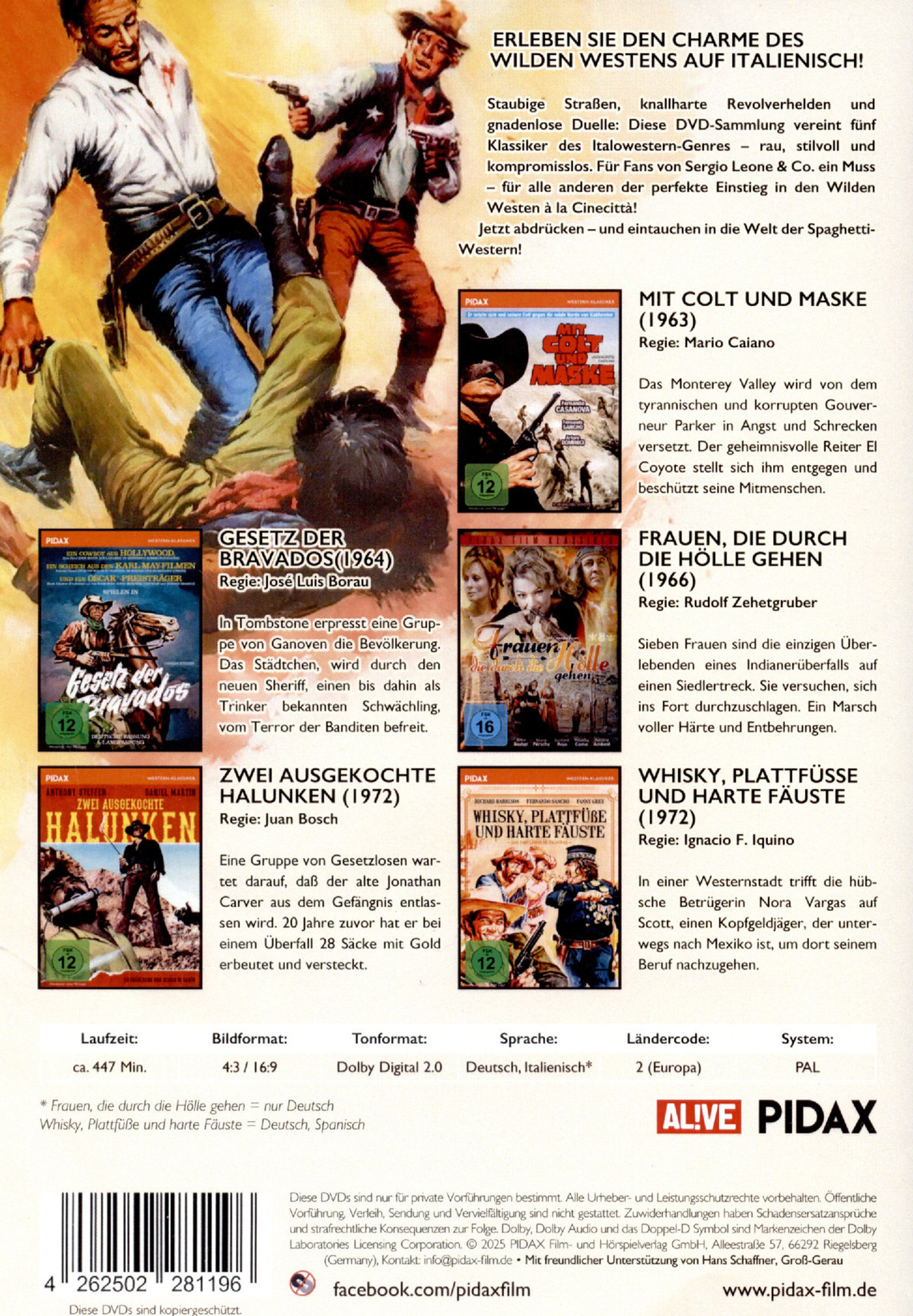 Erleben Sie den Charme des Wilden Westens auf Italienisch! Staubige Straßen, knallharte Revolverhelden und gnadenlose Duelle: Diese DVD-Sammlung vereint fünf Klassiker des Italowestern-Genres - rau, stilvoll und kompromisslos. Für Fans von Sergio Leone & Co. ein Muss - für alle anderen der perfekte Einstieg in den Wilden Westen à la Cinecittà! Jetzt abdrücken - und eintauchen in die Welt der Spaghetti-Western!