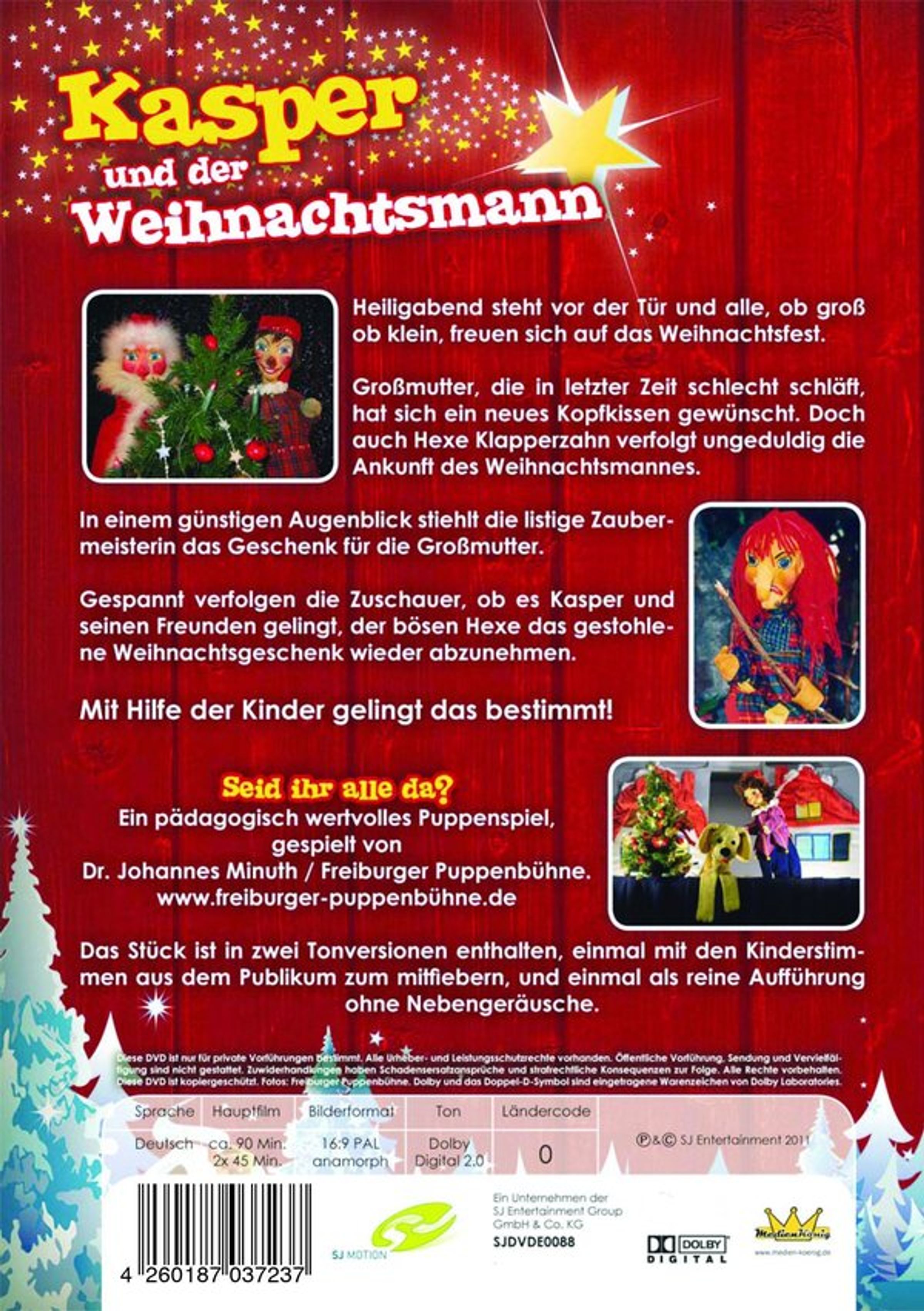 Heiligabend steht vor der Tür und alle freuen sich auf das Weihnachtsfest. Großmutter, die in letzter Zeit schlecht schläft, hat sich ein neues Kopfkissen gewünscht. Doch auch Hexe Klapperzahn verfolgt ungeduldig die Ankunft des Weihnachtsmannes. In einem günstigen Augenblick stiehlt die listige Zaubermeisterin das Geschenk für die Großmutter. Gespannt verfolgen die Zuschauer, ob es Kasper und seinen Freunden gelingt, der bösen Hexe das gestohlene Weihnachtsgeschenk wieder abzunehmen. Mit Hilfe der Kinder gelingt das bestimmt!
