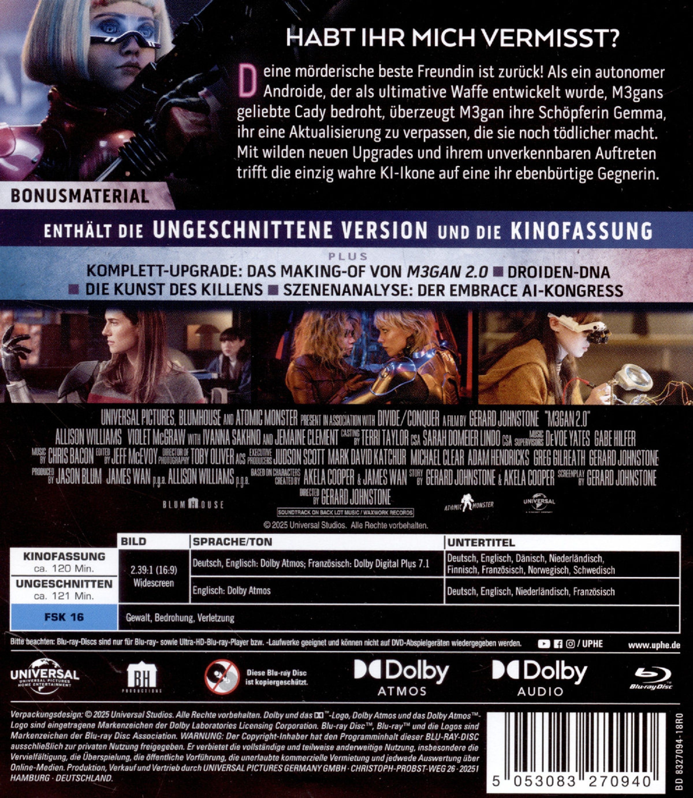 Zwei Jahre sind vergangen, seit M3GAN, Wunderwerk künstlicher Intelligenz, abtrünnig geworden und auf einen mörderischen und tadellos choreografierten Amoklauf gegangen ist, bevor sie schließlich zerstört wurde. Ihre Schöpferin Gemma ist inzwischen nicht nur eine renommierte Autorin, sondern auch eine flammende Verfechterin von K.I.-Auflagen seitens der Regierung. Aus Gemmas Nichte Cady ist mittlerweile eine Teenagerin geworden, die immer lauter gegen die Regeln ihrer überfürsorglichen Tante rebelliert. Ohne ihr beider Wissen wurde die M3GAN zugrunde liegende Technologie gestohlen und von einer mächtigen Rüstungsfirma missbraucht, um eine militärische Waffe zu kreieren - Amelia, die ultimative Spionin zur Infiltration und Tötung. Doch mit wachsender Selbstwahrnehmung hat Amelia immer weniger Interesse daran, Befehle von Menschen entgegenzunehmen. Oder diese auch nur um sich zu haben ...