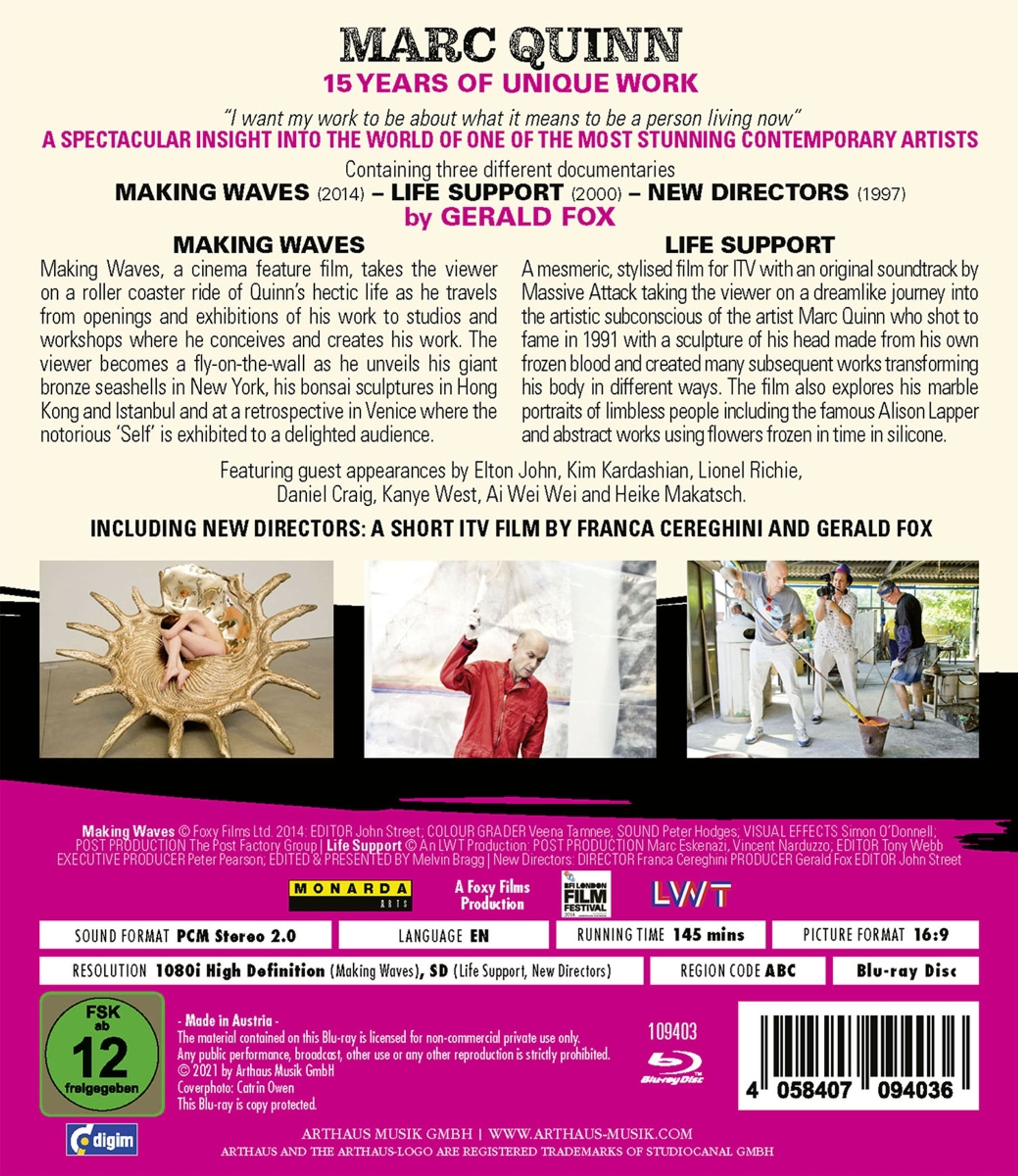 Der Kinofilm Making Waves nimmt den Zuschauer mit auf eine Achterbahnfahrt durch das hektische Leben von Marc Quinn, während er von Vernissagen in sein Studio und zu Workshops reist, bei denen er seine Arbeiten konzipiert und kreiert.