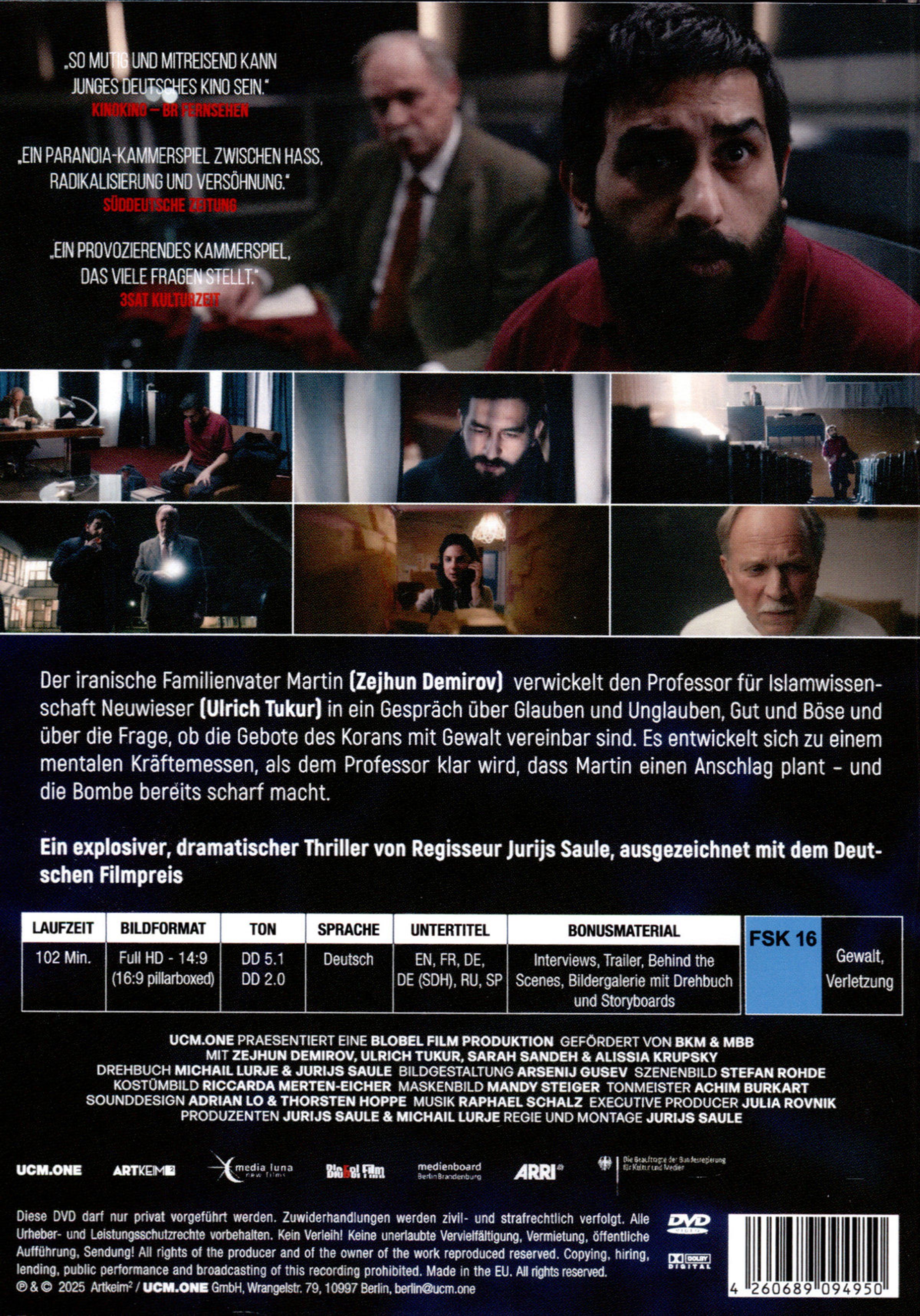 Was scheinbar harmlos im Film »Martin liest den Koran« von Jurijs Saule beginnt, entwickelt sich zu einem mentalen Kräftemessen, als dem Professor klar wird, dass sein Besucher einen Anschlag plant - und die Bombe bereits scharf macht. Nichts steht fest, nichts ist so, wie es scheint in diesem Drama, das drängende Fragen nach Hass und Versöhnung, den Ursachen von Radikalisierung, gegenseitiger