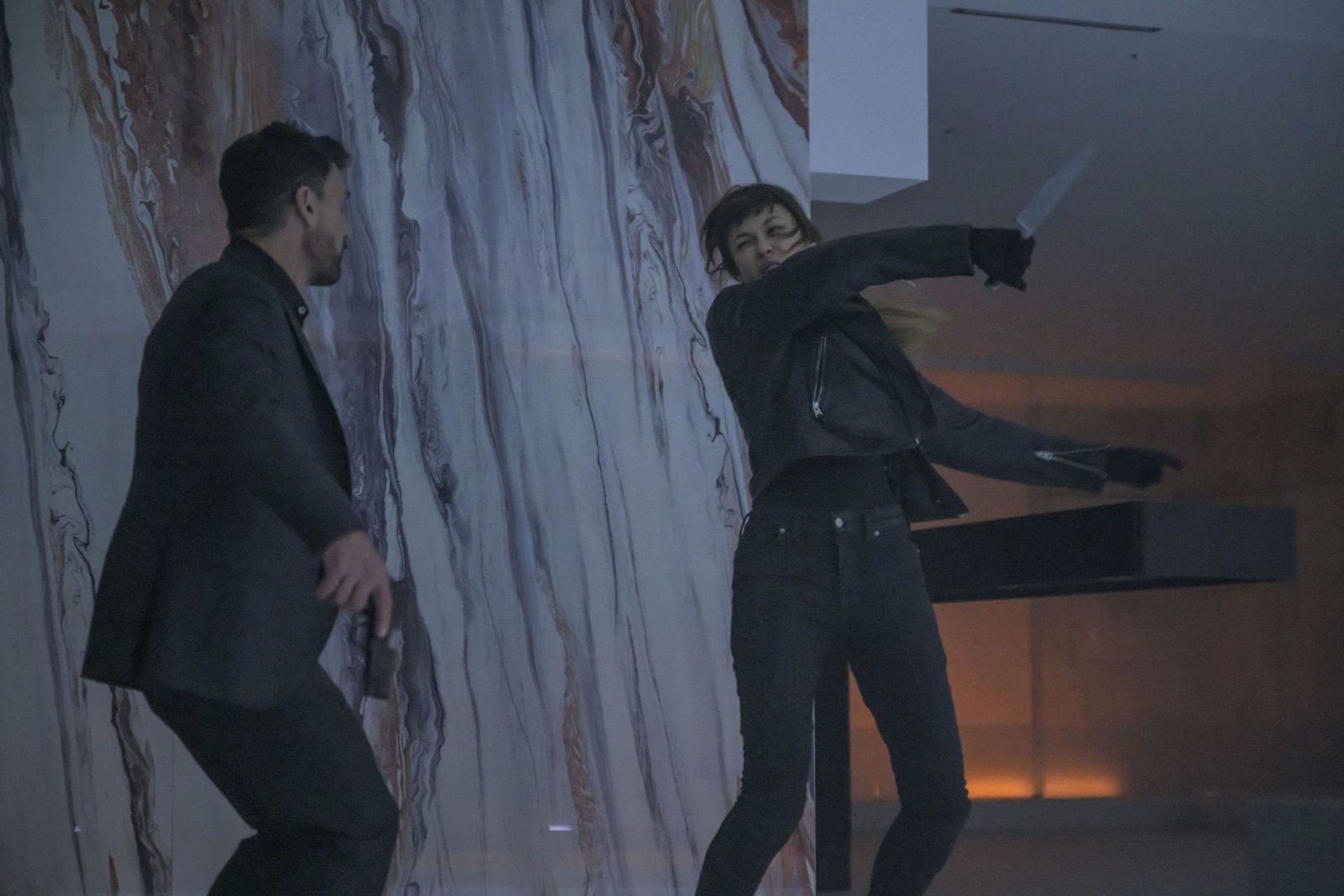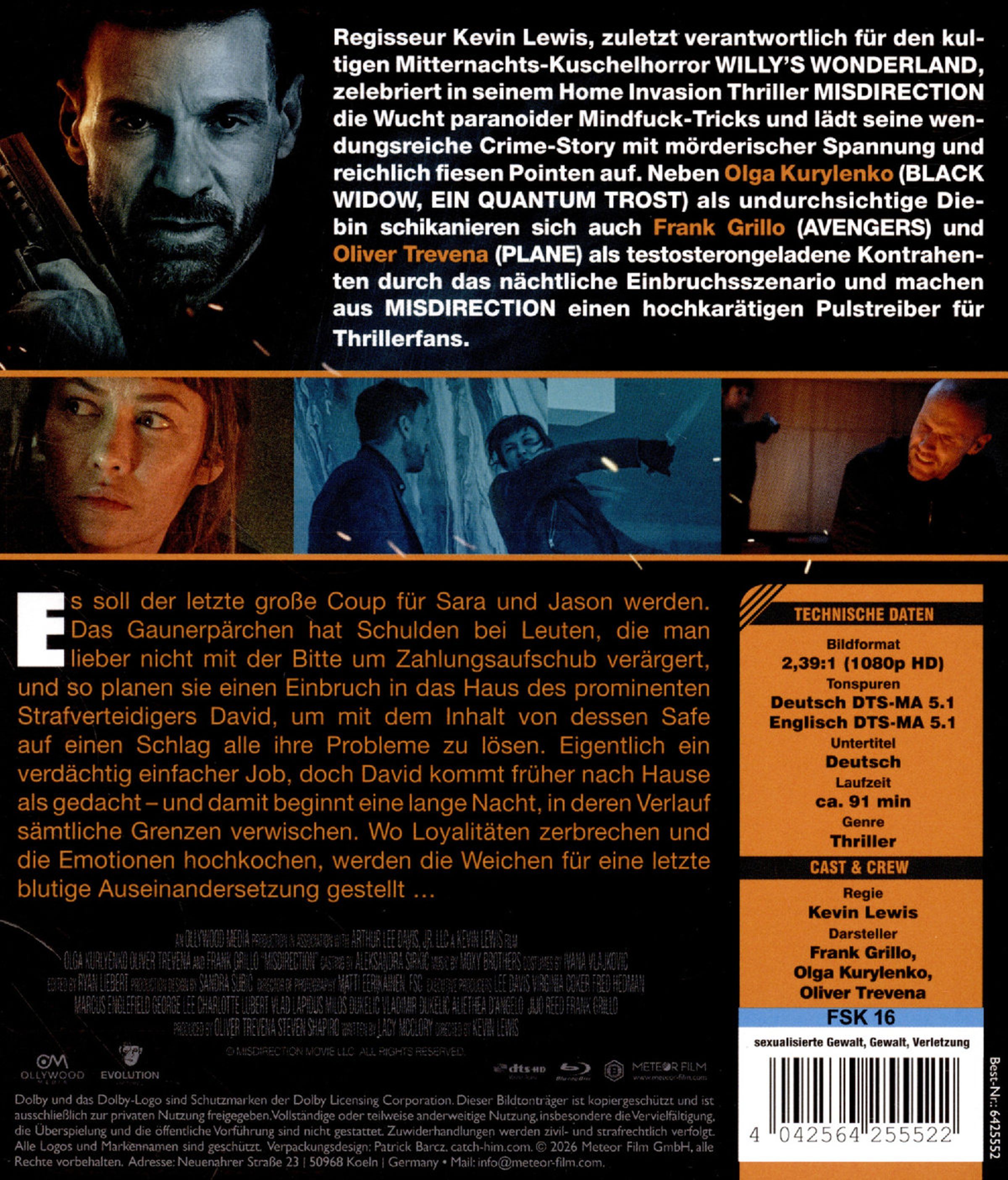 Text: "Olga Kurylenko, Oliver Trevena und Frank Grillo. Misdirection. Rache sitzt tief." Dunkle Szene, brennendes Auto, Waffen., Blu-ray Disc