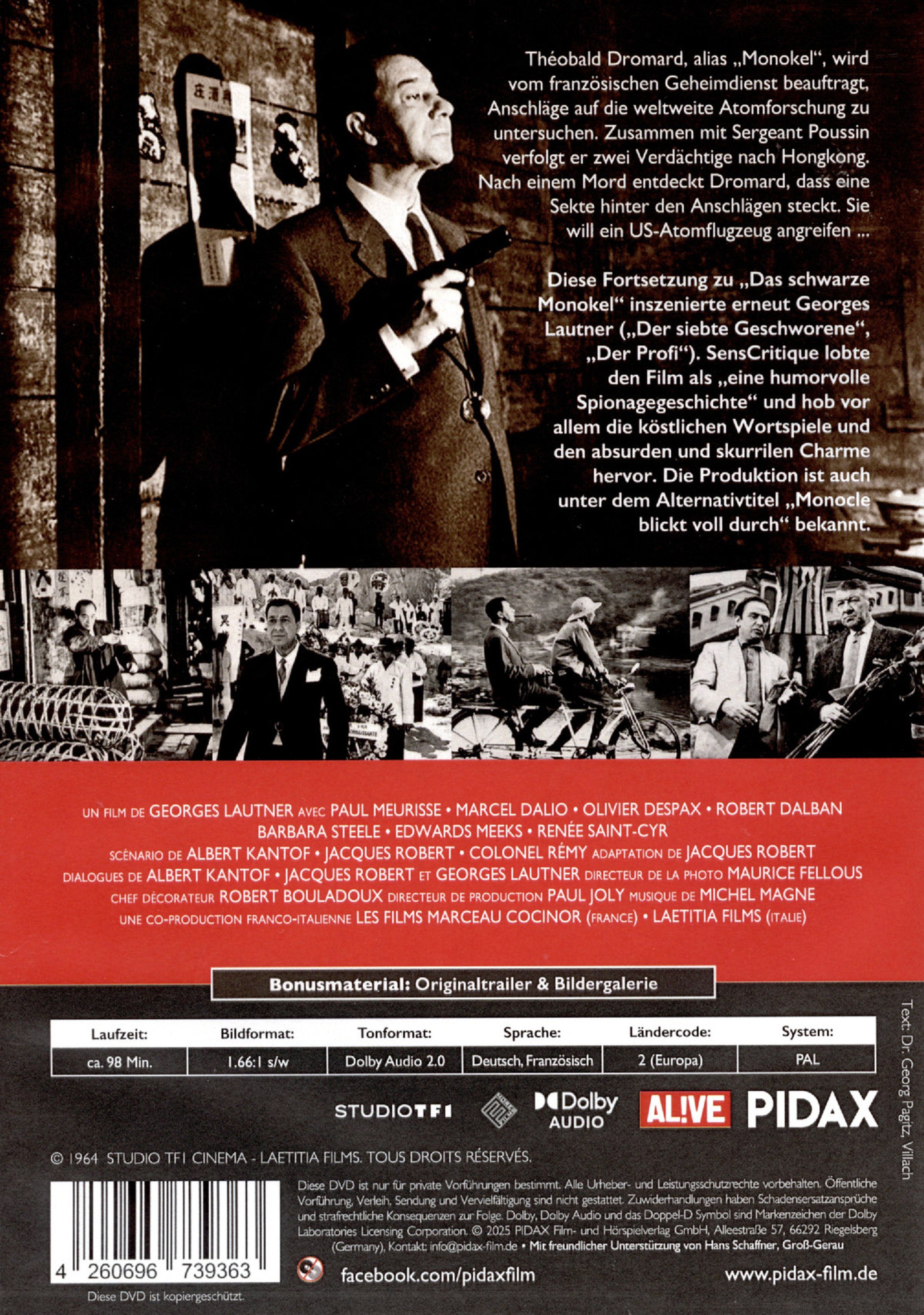 Théobald Dromard, alias Monokel, wird vom französischen Geheimdienst beauftragt, Anschläge auf die weltweite Atomforschung zu untersuchen. Zusammen mit Sergeant Poussin verfolgt er zwei Verdächtige nach Hongkong. Nach einem Mord entdeckt Dromard, dass eine Sekte hinter den Anschlägen steckt. Sie will ein US-Atomflugzeug angreifen ...