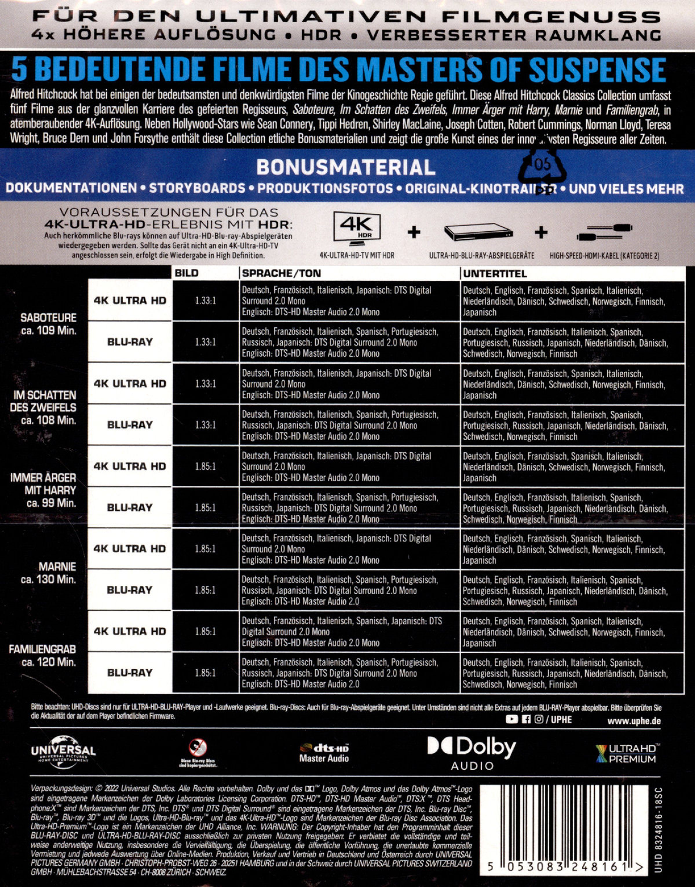 Diese Alfred Hitchcock Classics Collection umfasst fünf Filme aus der glanzvollen Karriere des gefeierten Regisseurs, »Saboteure«, »Im Schatten des Zweifels«, »Immer ärger mit Harry«, »Marnie« und »Familiengrab«, in atemberaubender 4K Auflösung.