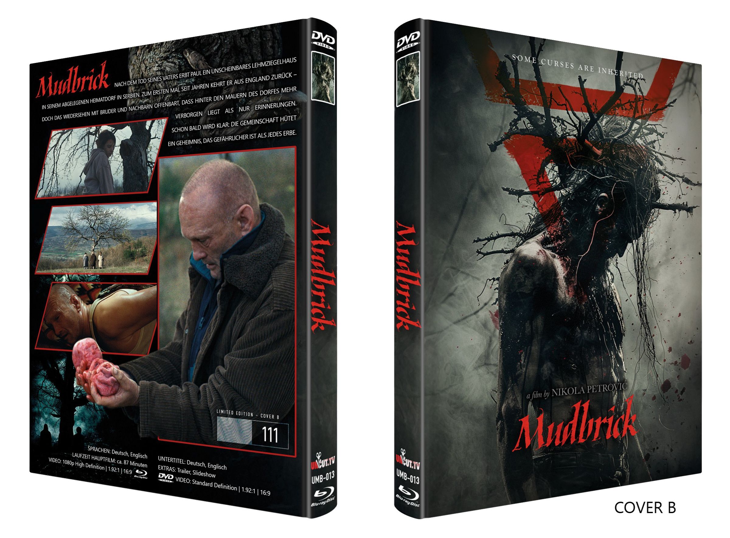 „Mudbrick“, „Some curses are inherited“, Mann mit Zweigen als Krone, verschiedene Filmszenen, düstere Atmosphäre., 1 Blu-ray Disc und 1 DVD