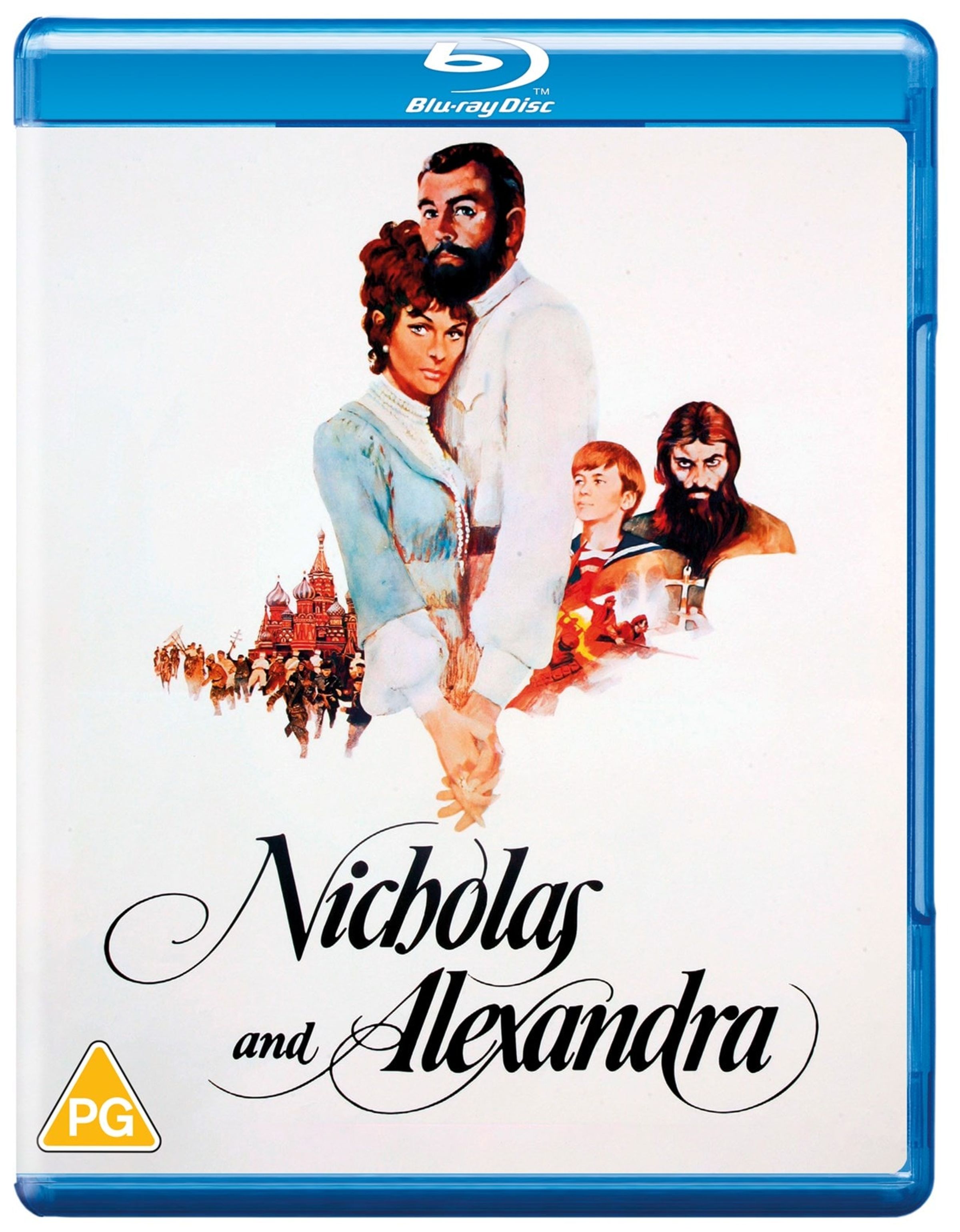 Text: "Nicholas and Alexandra". Illustration: Ein Paar prominent im Vordergrund, mit historischen Figuren und Gebäuden im Hintergrund., Blu-ray Disc