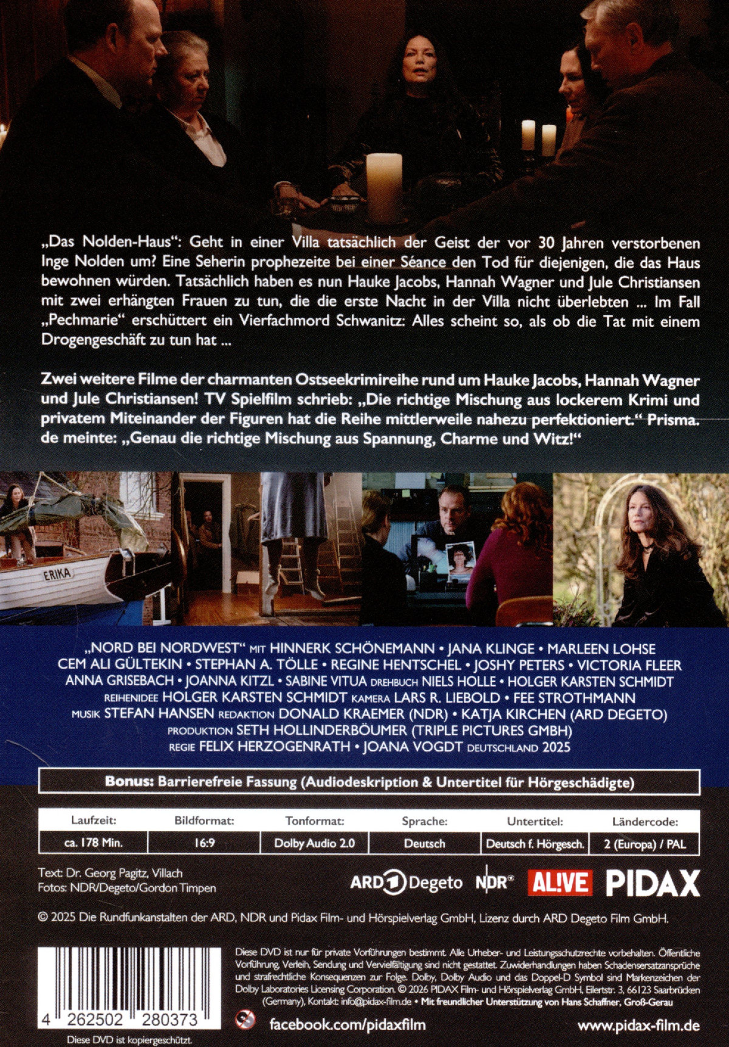 »Das Nolden-Haus«: Ging in einer Villa tatsächlich der Geist der vor 30 Jahren verstorbenen Inge Nolden um? Eine Seherin prophezeite bei einer Séance den Tod für diejenigen, die das Haus bewohnen würden. Tatsächlich haben es nun Hauke Jacobs, Hannah Wagner und Jule Christiansen mit zwei erhängten Frauen zu tun, die die erste Nacht in der Villa nicht überlebten ... Im Fall »Pechmarie« erschüttert ein Vierfachmord Schwanitz: Alles scheint so, als ob die Tat mit einem Drogengeschäft zu tun hat ...