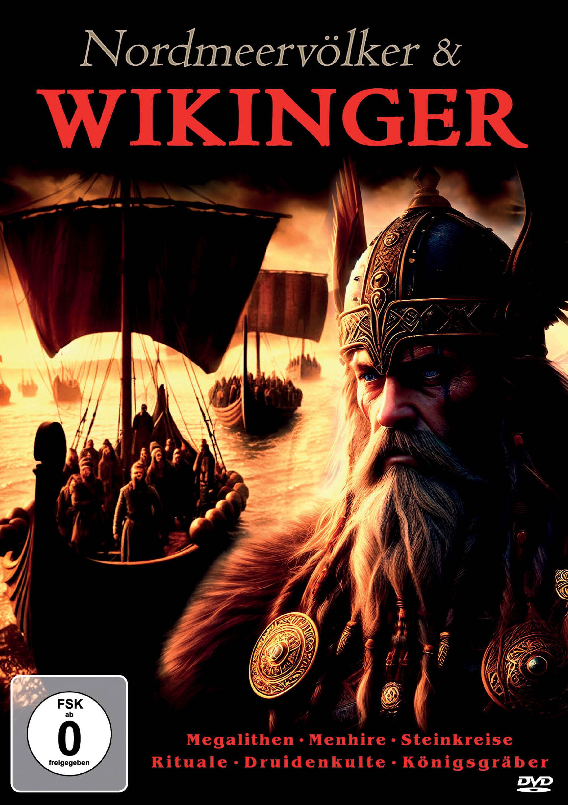„Nordmeervölker & Wikinger“ in roter und weißer Schrift. Krieger mit Helm, Langschiffe im Hintergrund bei Sonnenuntergang., DVD