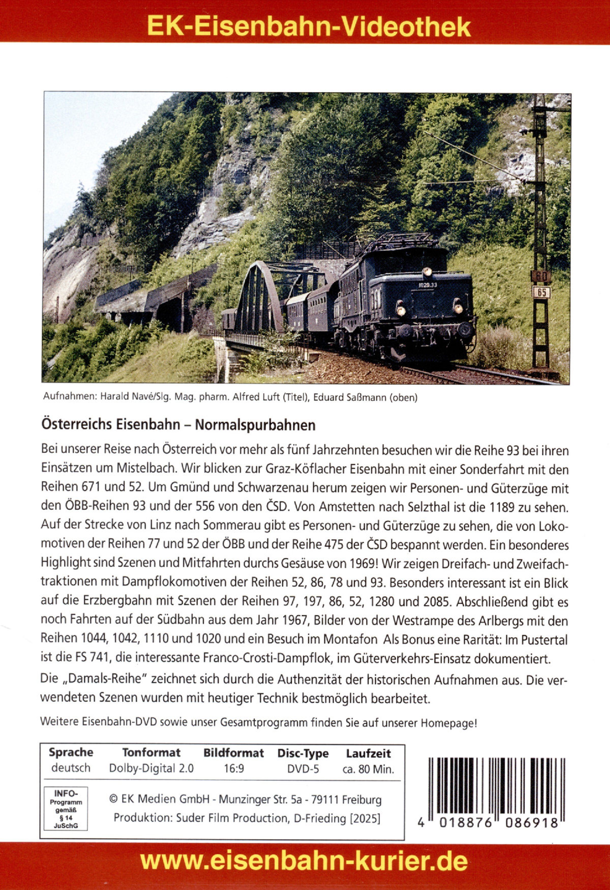 Bei unserer Reise nach Österreich vor mehr als fünf Jahrzehnten besuchen wir die Reihe 93 bei ihren Einsätzen um Mistelbach. Wir blicken zur Graz-Köflacher Eisenbahn mit einer Sonderfahrt mit den Reihen 671 und 52. Um Gmünd und Schwarzenau herum zeigen wir Personen- und Güterzüge mit den ÖBB-Reihen 93 und der 556 von den CSD. Von Amstetten nach Selzthal ist die 1189 zu sehen. Auf der Strecke von Linz nach Sommerau gibt es Personen- und Güterzüge zu sehen, die von Lokomotiven der Reihen 77 und 52 der ÖBB und der Reihe 475 der CSD bespannt werden. Ein besonderes Highlight sind Szenen und Mitfahrten durchs Gesäuse von 1969! Wir zeigen Dreifach- und Zweifachtraktionen mit Dampflokomotiven der Reihen 52, 86, 78 und 93. Besonders interessant ist ein Blick auf die Erzbergbahn mit Szenen der Reihen 97, 197, 86, 52, 1280 und 2085. Abschließend gibt es noch Fahrten auf der Südbahn aus dem Jahr 1967, Bilder von der Westrampe des Arlbergs mit den Reihen 1044, 1042, 1110 und 1020 und ein Besuch im Montafon.
