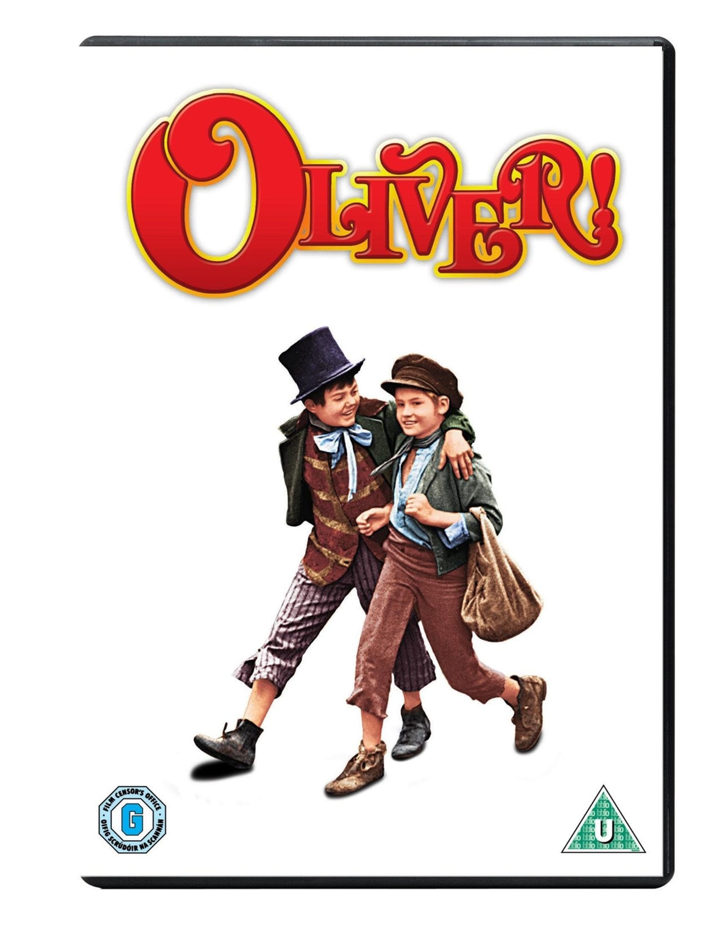 "Oliver!" in roter Schrift oben. Zwei fröhliche Jungen in historischen Kostümen umarmen sich., DVD