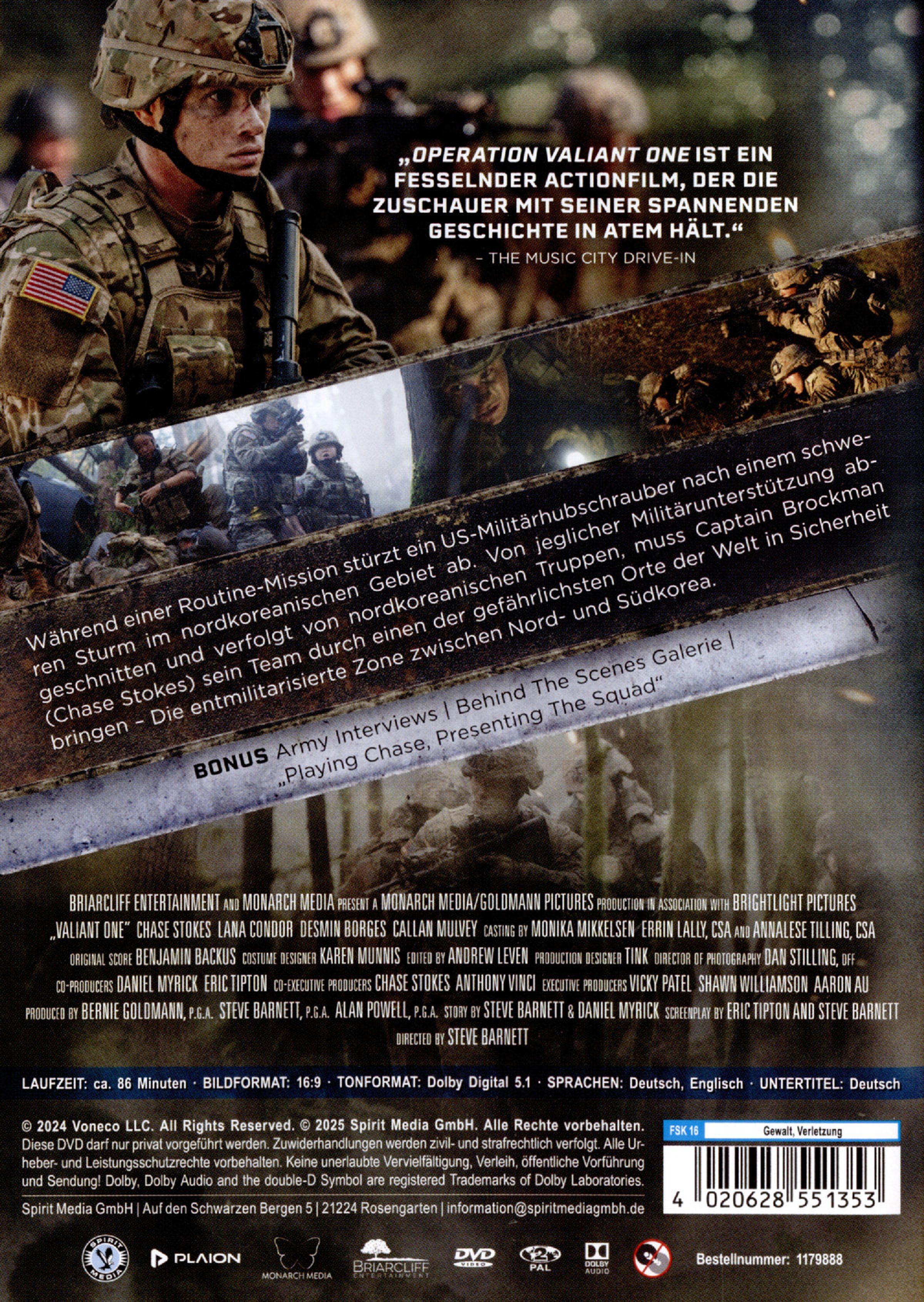 Während einer routinemäßigen Mission an der Grenze zwischen Nord- und Südkorea, stürzt ein amerikanischer Militärhubschrauber nach einem schweren Sturm im nordkoreanischen Gebiet ab. Nachdem ihr Vorgesetzter stirbt und sie von jeglicher Militärunterstützung abgeschnitten werden, müssen Captain Edward Brockman (Chase Stokes) und Sanitäterin Selby (Lana Condor) ihr Team durch feindliches Terrain führen. Nordkoreanische Truppen sind ihnen dicht auf den Fersen, als sie versuchen sich über die gefährlichste Grenze der Welt in Sicherheit zu bringen. Als ein US-Militärhubschrauber bei einer Routinemission über der koreanischen Grenze abstürzt, beginnt ein verzweifelter Überlebenskampf hinter feindlichen Linien. Ohne Kommunikation, ohne Rückhalt – und mit nordkoreanischen Truppen im Nacken – müssen der neue Captain Edward Brockman (Chase Stokes) und die mutige Sanitäterin Selby (Lana Condor) ihr Team durch das tödlichste Grenzgebiet der Welt führen. Mit einem hochkarätigen Cast und atemloser Spannung liefert Mission Valiant One einen kompromisslosen Überlebens-Thriller, in dem Mut, Zusammenhalt und Entschlossenheit über Leben und Tod entscheiden.