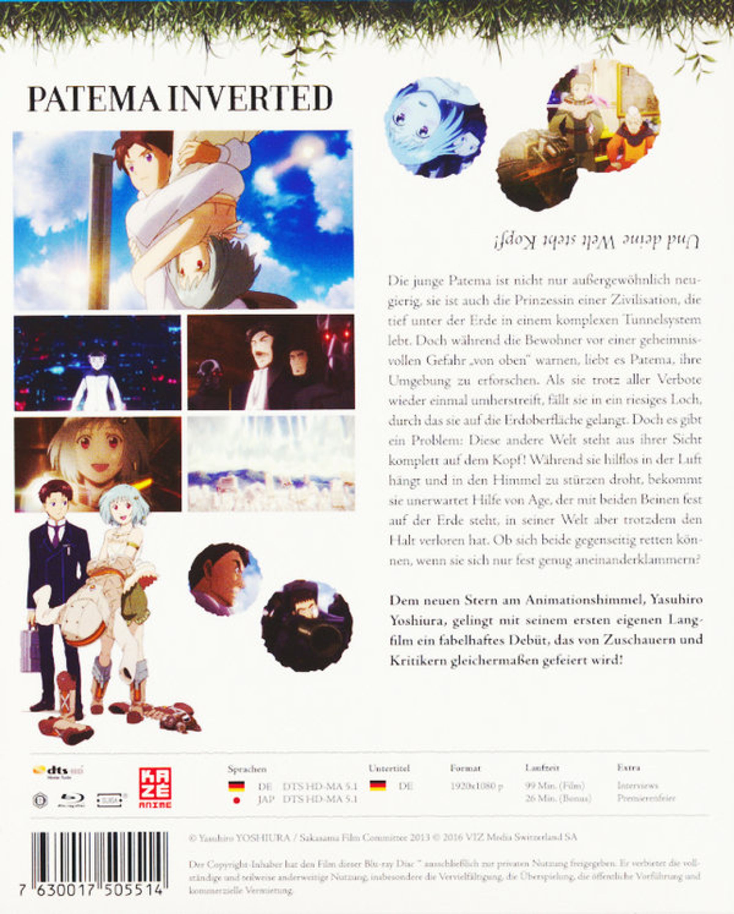 Die junge Patema ist nicht nur außergewöhnlich neugierig, sie ist auch die Prinzessin einer Zivilisation, die tief unter der Erde in einem komplexen Tunnelsystem lebt. Doch während die Bewohner vor einer geheimnisvollen Gefahr „von oben“ warnen, liebt es Patema, ihre Umgebung zu erforschen. Als sie trotz aller Verbote wieder einmal umherstreift, fällt sie in ein riesiges Loch, durch das sie auf die Erdoberfläche gelangt. Doch es gibt ein Problem: Diese andere Welt steht aus ihrer Sicht komplett auf dem Kopf! Während sie hilflos in der Luft hängt und in den Himmel zu stürzen droht, bekommt sie unerwartet Hilfe von Age, der mit beiden Beinen fest auf der Erde steht, in seiner Welt aber trotzdem den Halt verloren hat. Ob sich beide gegenseitig retten können, wenn sie sich nur fest genug aneinanderklammern?