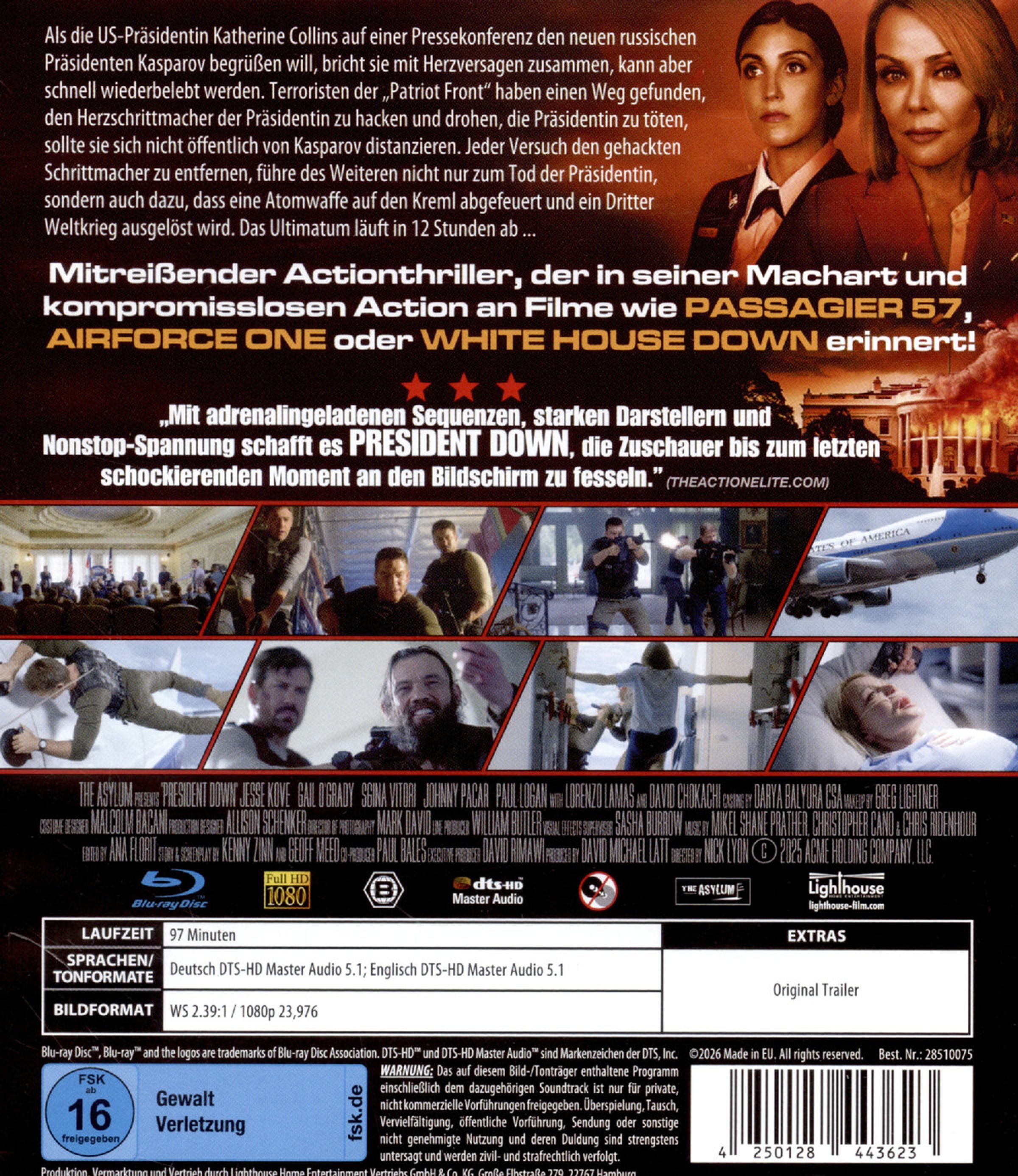 »'The Asylum' produziert zwar keine Blockbuster, doch mit 'President Down' liefern sie einen packenden Thriller ab, der an die Hollywood-Filme der 90er-Jahre erinnert. Intelligente Handlung, überzeugende Darsteller und ein elektrisierendes Ende - alles ist vorhanden.« (filmthreat.com)»Freuen Sie sich auf Nervenkitzel, jede Menge Feuerkraft und Heldentum in einem Film, der die DTV-Ära der 80er und 90er Jahre mit neuem Leben füllt.« (action-flix.com)