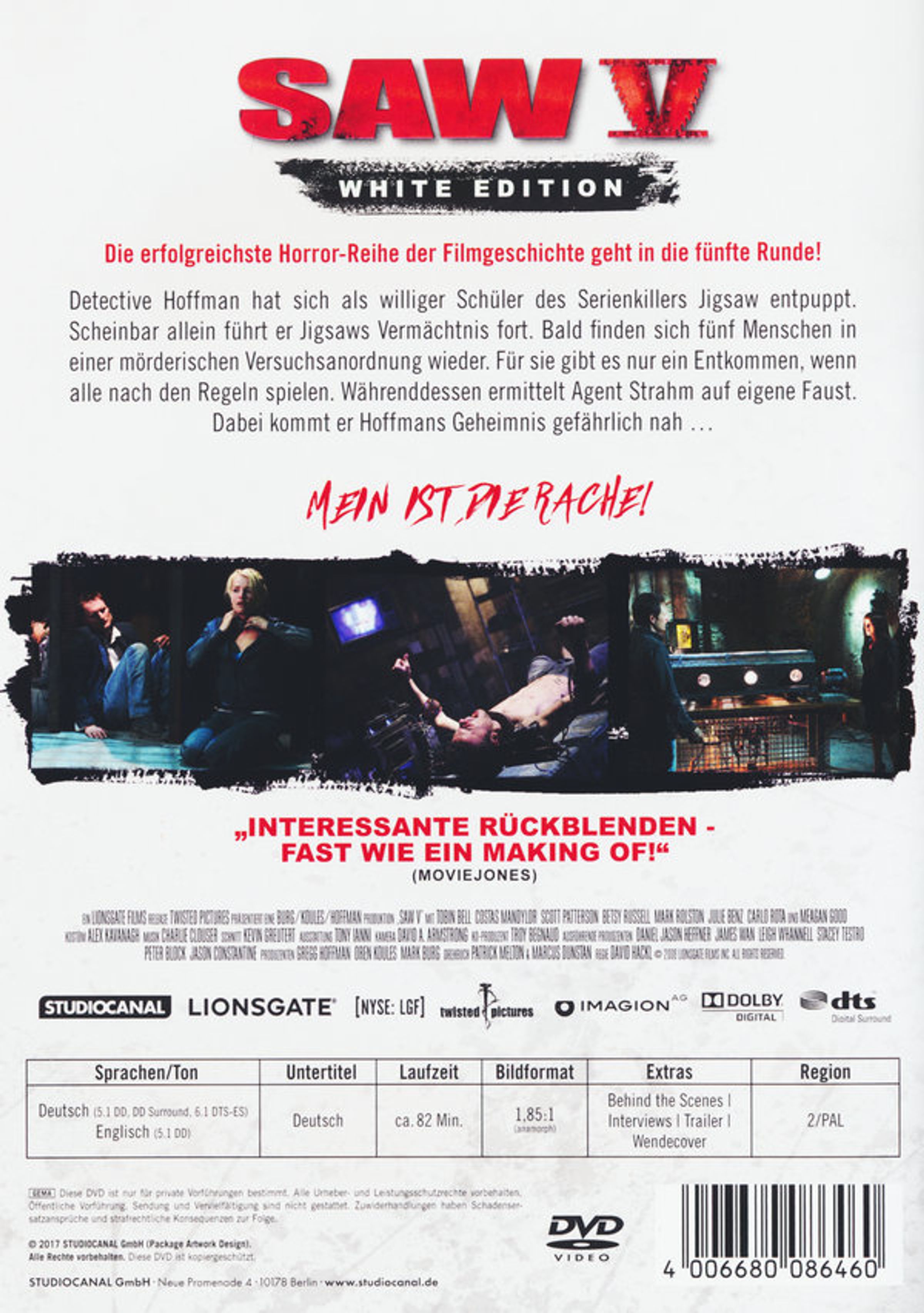 - Audiokommentare; SAW - Der Kurzfilm; Musikvideos; Billie - Die Jigsaw-Puppe; 52 Arten zu sterben - Die Fallen von SAW; Featurettes; Jigsaws Fallen
