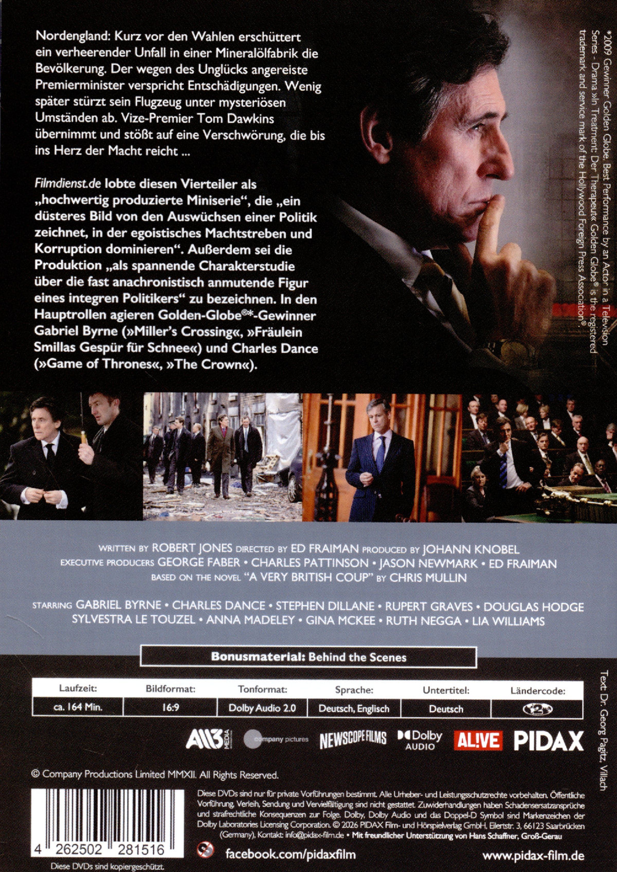 Text: "Gabriel Byrne, Charles Dance, Secret State, Die komplette Miniserie, FSK ab 12 freigegeben." Zwei Männer im Anzug., DVD
