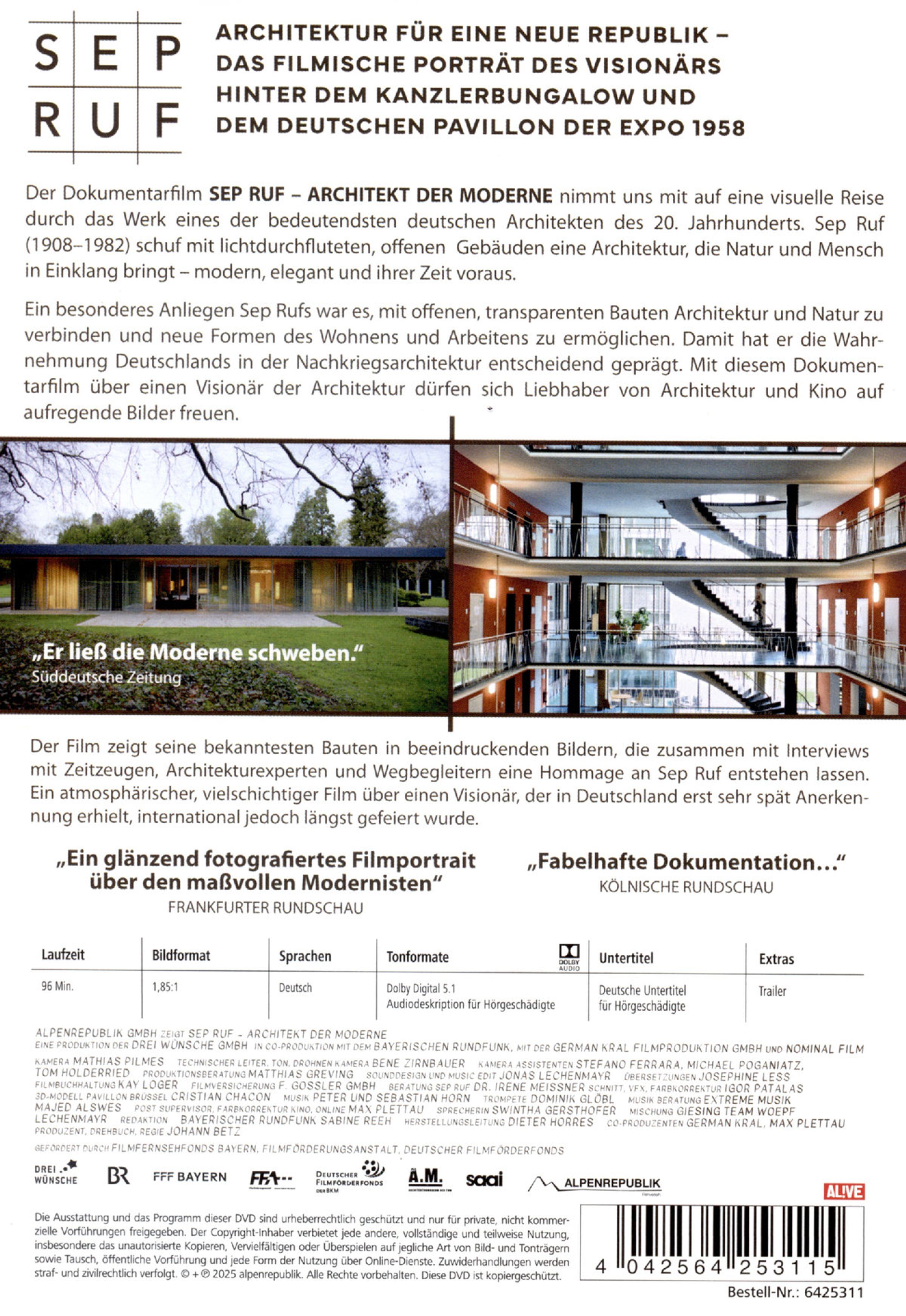 Der Film zeigt seine bekanntesten Bauten in beeindruckenden Bildern: den Deutschen Pavillon auf der Weltausstellung 1958 in Brüssel (mit Egon Eiermann), den ikonischen Kanzlerbungalow in Bonn, die Akademie der Bildenden Künste in Nürnberg, die Neue Maxburg in München und viele mehr. Viele dieser Werke sind heute denkmalgeschützt. Interviews mit Zeitzeugen, Architekturexperten und Wegbegleitern lassen zusammen mit den architektonischen Bildern eine Hommage an Sep Ruf entstehen. Ein atmosphärischer, vielschichtiger Film über einen Visionär, der in München erst sehr spät Anerkennung erhielt, international jedoch längst gefeiert wurde.