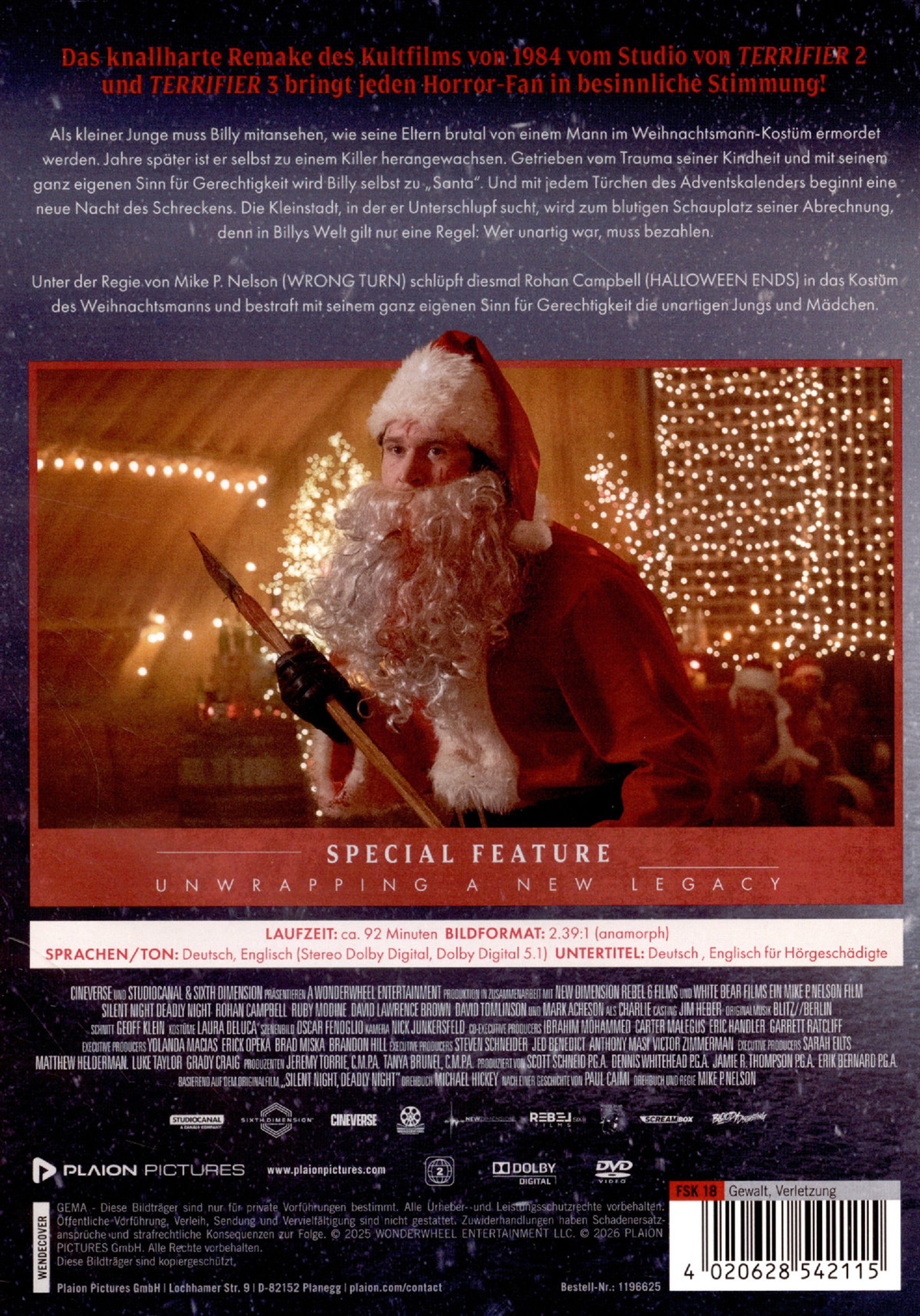 Als kleiner Junge muss Billy mitansehen, wie seine Eltern brutal von einem Mann im Weihnachtsmann-Kostüm ermordet werden. Jahre später ist er selbst zu einem Killer herangewachsen. Getrieben vom Trauma seiner Kindheit und mit seinem ganz eigenen Sinn für Gerechtigkeit wird Billy selbst zu »Santa«. Und mit jedem Türchen des Adventskalenders beginnt eine neue Nacht des Schreckens. Die Kleinstadt, in der er Unterschlupf sucht, wird zum blutigen Schauplatz seiner Abrechnung, denn in Billys Welt gilt nur eine Regel: Wer unartig war, muss bezahlen.