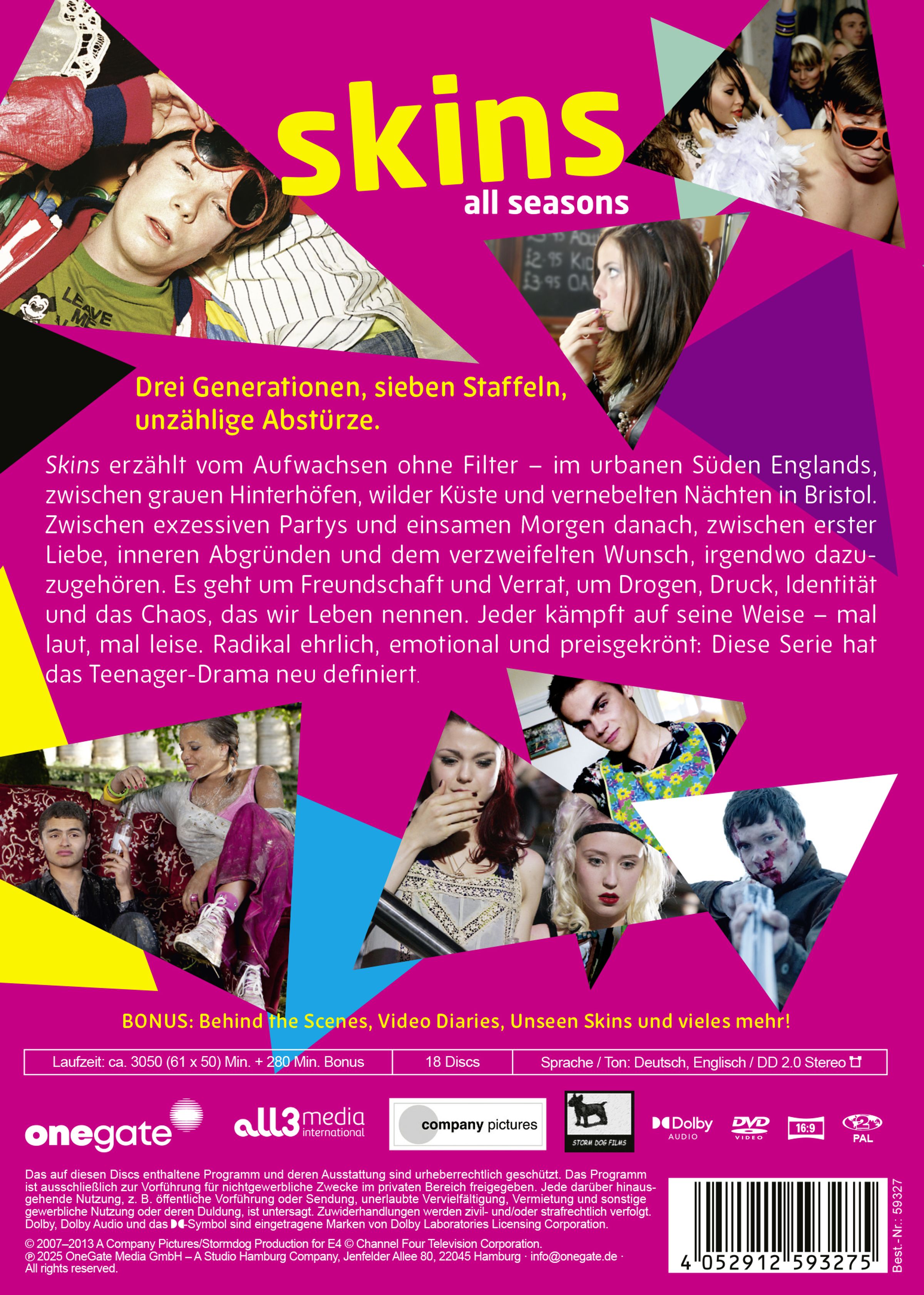 Skins erzählt vom Aufwachsen ohne Filter - im urbanen Süden Englands, zwischen grauen Hinterhöfen, wilder Küste und vernebelten Nächten in Bristol. Zwischen exzessiven Partynächten und einsamen Morgen danach, zwischen erster Liebe, inneren Abgründen und dem verzweifelten Wunsch, irgendwo dazuzugehören. Es geht um Freundschaft und Verrat, um Drogen, Druck, Identität und das Chaos, das man Leben nennt. Jeder kämpft auf seine Weise – mal laut, mal leise. Radikal ehrlich, emotional und preisgekrönt: Diese Serie hat das Teenager-Drama neu definiert.