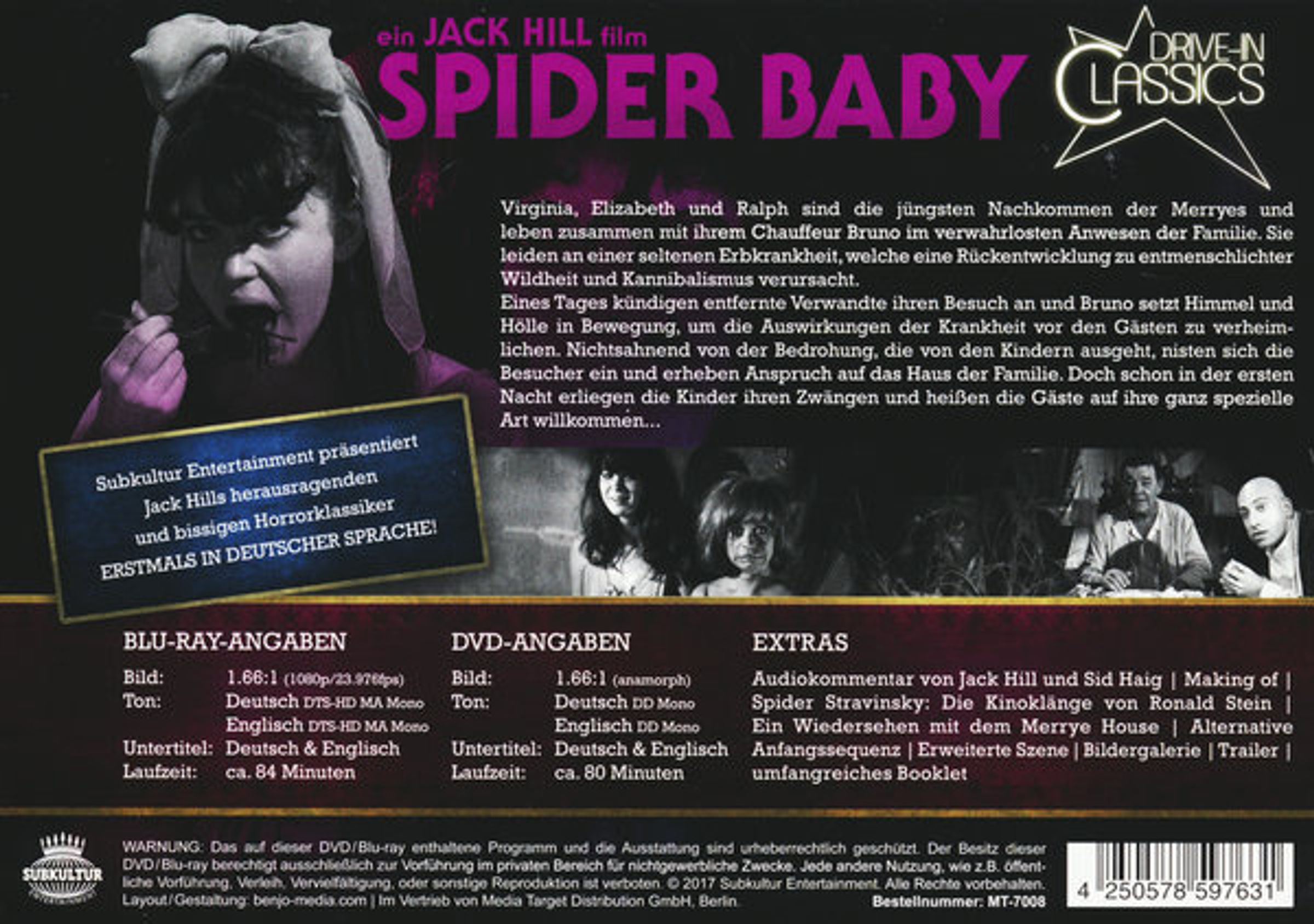 - Booklet; Audiokommentare; Making of: The Hatching of Spider Baby; Spider Stravinsky: Die Kinoklänge von Ronald Stein; Ein Wiedersehen mit dem Merrye House; Alternative Anfangssequenz; Erweiterte Szene; Bildergalerie