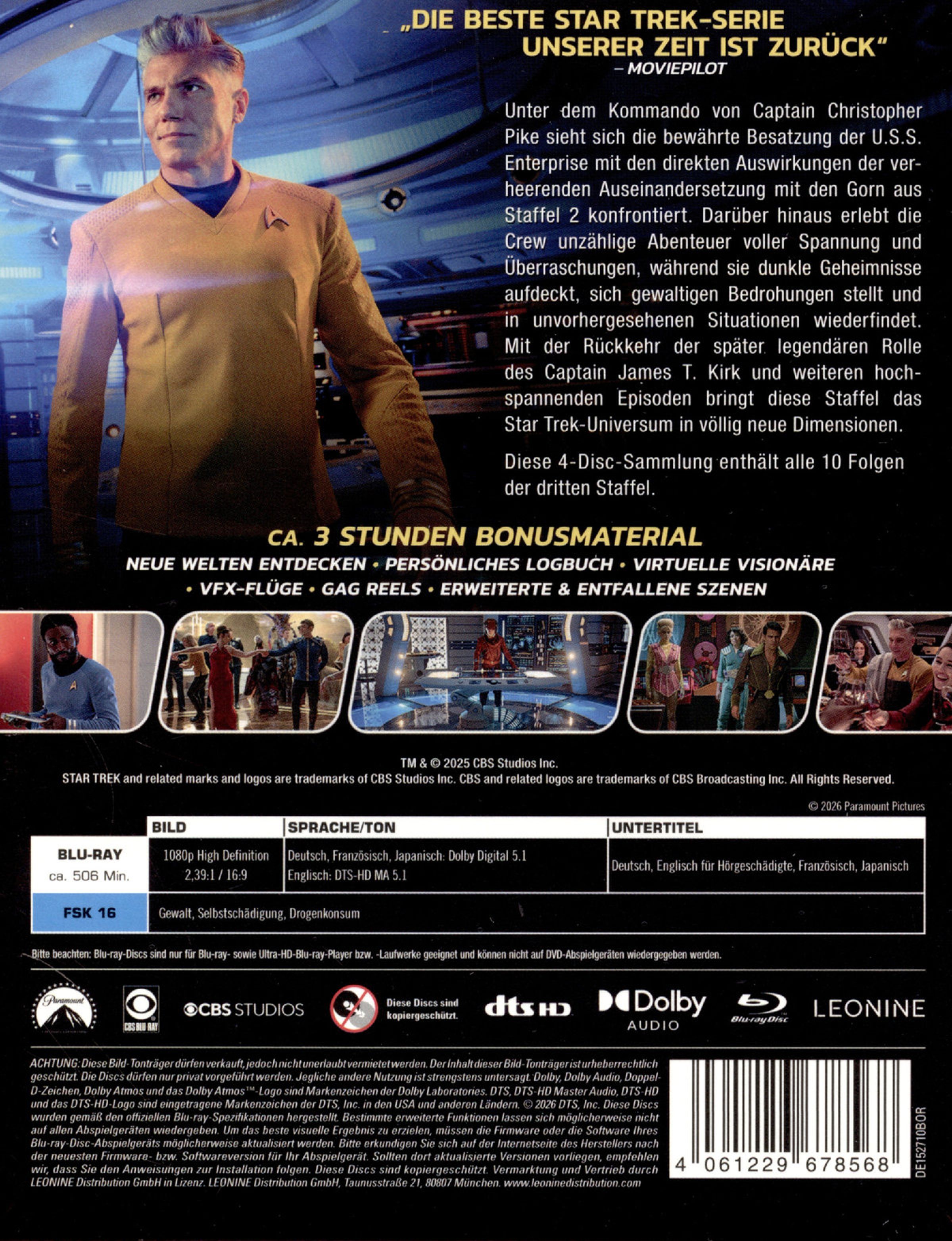 Unter dem Kommando von Captain Christopher Pike sieht sich die bewährte Besatzung der U.S.S. Enterprise mit den Auswirkungen der verheerenden Gorn-Invasion aus Staffel 2 konfrontiert. Darüber hinaus erlebt die Crew unzählige Abenteuer voller Spannung und Überraschungen, während sie dunkle Geheimnisse aufdeckt, sich gewaltigen Bedrohungen stellt und sich in unvorhergesehenen Situationen wiederfindet. Mit der Einführung der später legendären Rolle des Captain James T. Kirk und weiteren hochspannenden Episoden bringt diese Staffel das Star Trek-Universum in völlig neue Dimensionen.