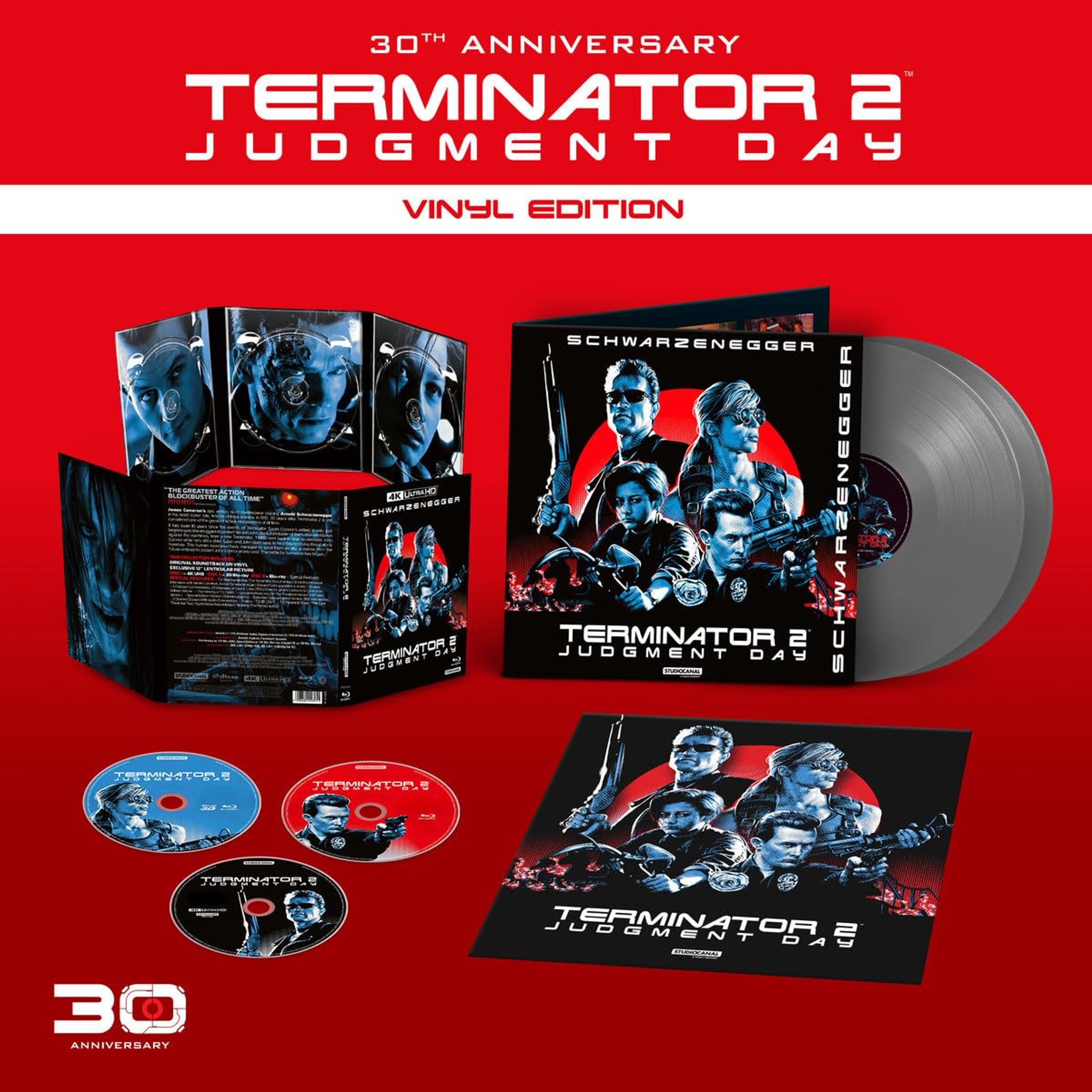 - 3-Disc Digipak mit der Kinofassung von TERMINATOR 2 auf 4K UHD Blu-ray; Blu-ray mit Kinofassung, dem Director’s Cut* und der Extended Special Edition*; 3D Blu-ray der Kinofassung; Original Filmsoundtrack auf Doppel-Vinyl in Gatefold-Cover und einem Lentikular-Druck des Coverartworks. (*seamless branching, zusätzliche Szenen nicht remastered)
