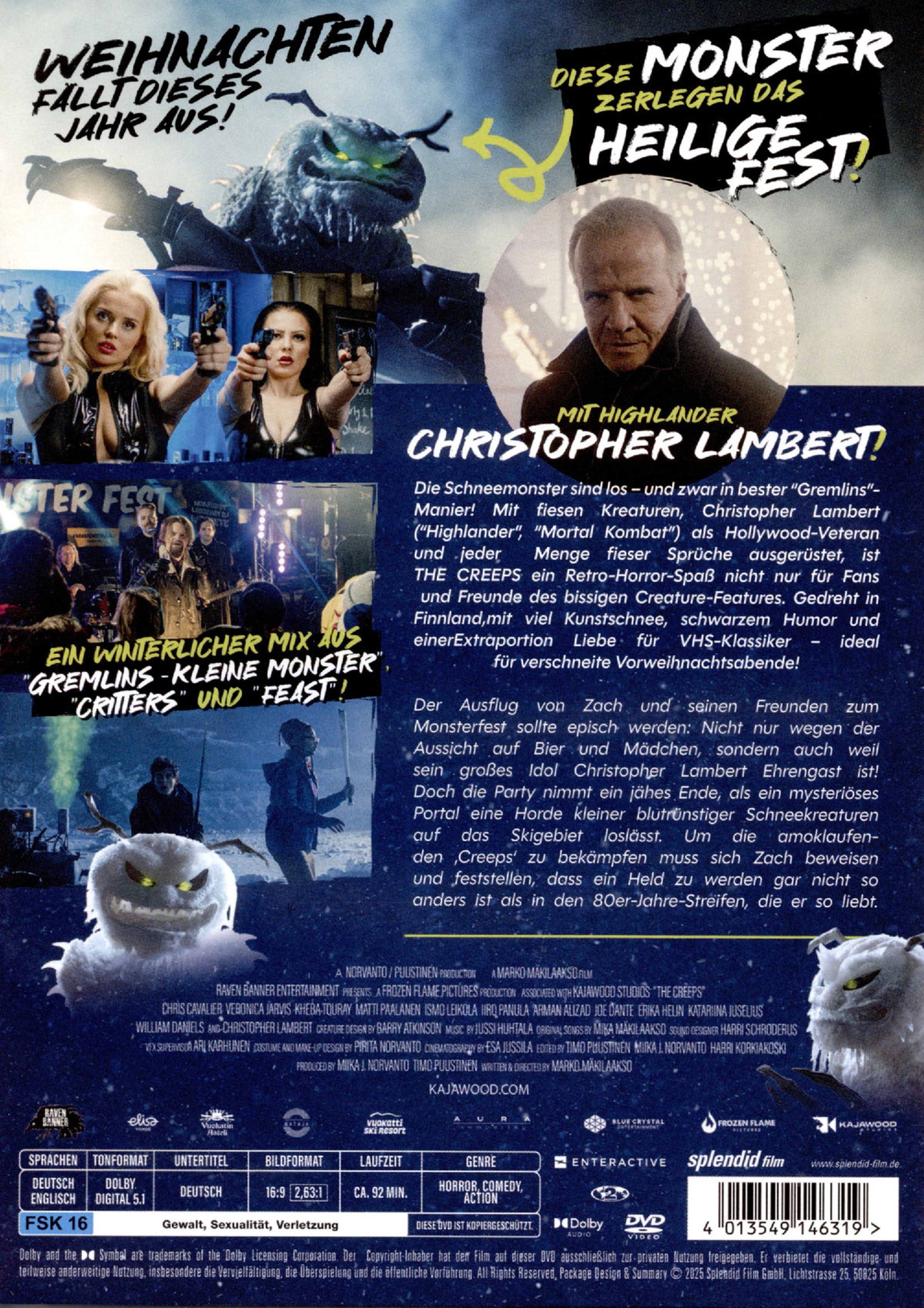 Die Schneemonster sind los - und zwar in bester »Gremlins«-Manier! Mit fiesen Kreaturen, Christopher Lambert als Hollywood-Veteran und jede Menge fieser Sprüche ausgerüstet, ist THE CREEPS ein Retro-Horror-Spaß nicht nur für Fans und Freunde des bissigen Creature-Features. Gedreht in Finnland, mit viel Kunstschnee, schwarzem Humor und einer Extraportion Liebe für VHS-Klassiker - ideal für verschneite Vorweihnachtsabende!