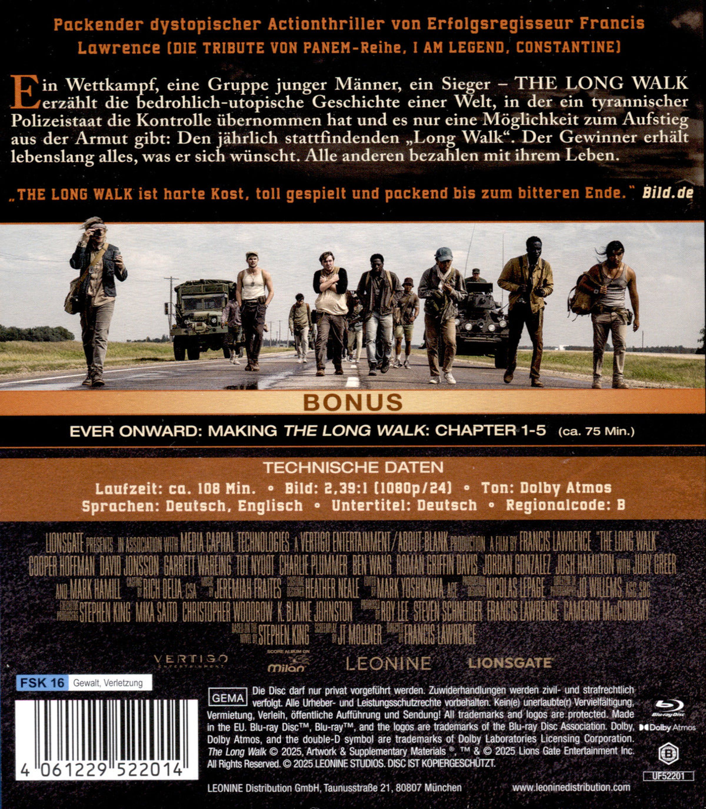 Ein Wettkampf, eine Gruppe junger Männer, ein Sieger - THE LONG WALK erzählt die bedrohlich-utopische Geschichte einer Welt, in der ein tyrannischer Polizeistaat die Kontrolle übernommen hat und es nur eine Möglichkeit zum Aufstieg aus der Armut gibt: Den jährlich stattfindenden »Long Walk«. Der Gewinner erhält lebenslang alles, was er sich wünscht. Alle anderen bezahlen mit ihrem Leben.