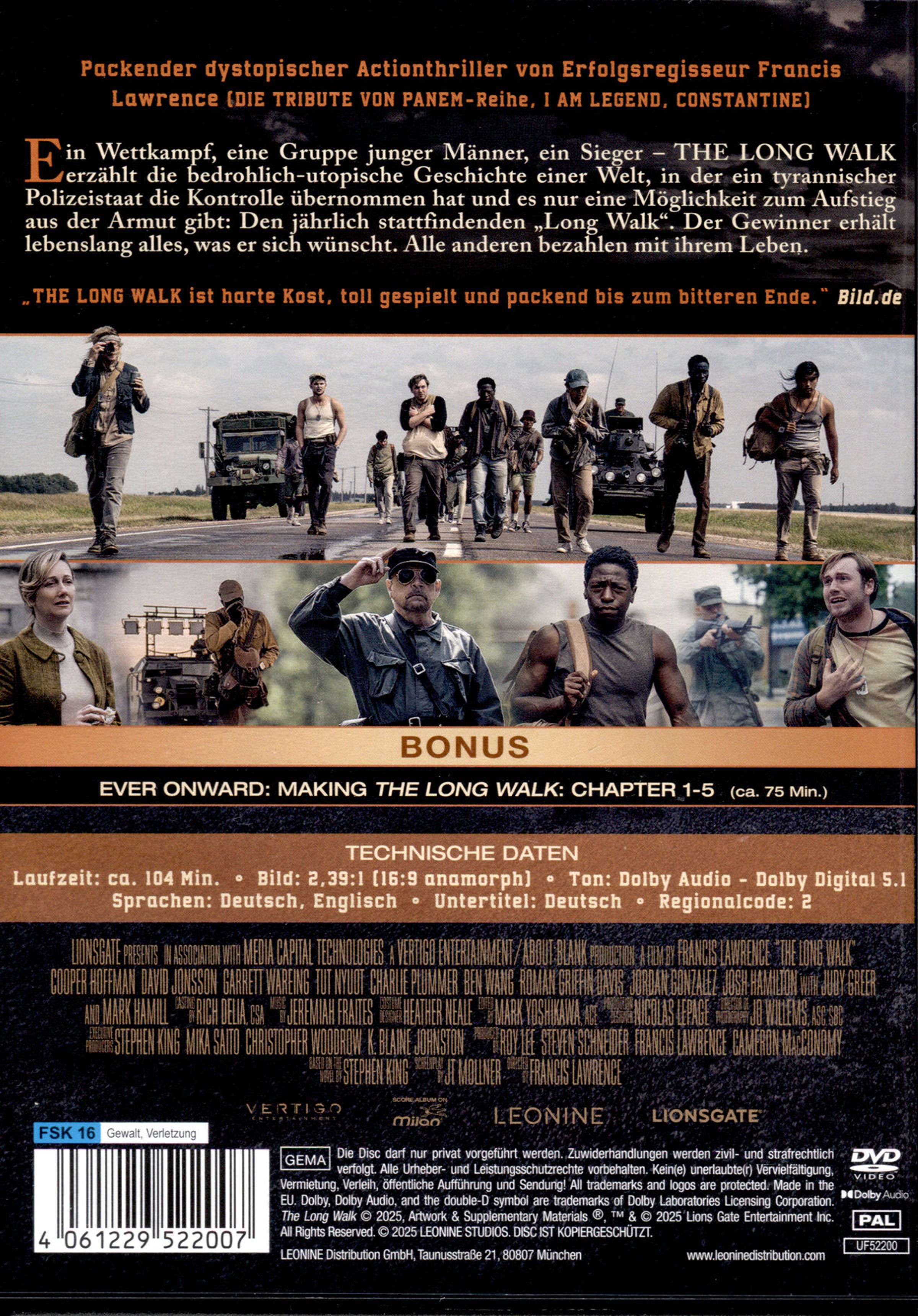 Text: "Vom legendären Autor Stephen King. THE LONG WALK - TODESMARSCH. Die Aufgabe ist einfach: LAUF ODER STIRB."