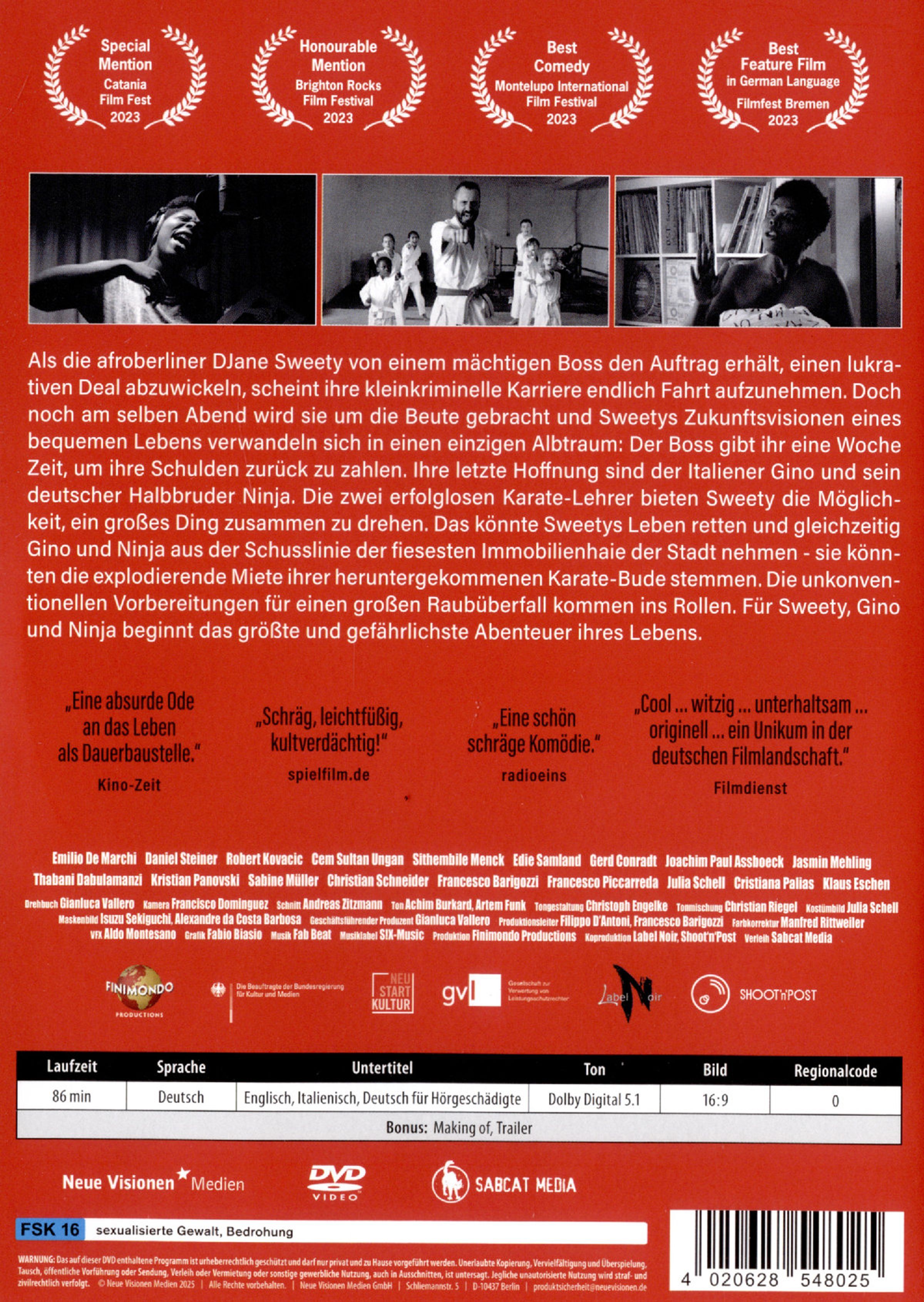 Als die Afro-Berliner DJane Sweety von einem mächtigen Boss den Auftrag erhält, einen lukrativen Deal abzuwickeln, scheint ihre kleinkriminelle Karriere endlich Fahrt aufzunehmen. Doch noch am selben Abend wird sie um die Beute gebracht und Sweetys Zukunftsvisionen eines bequemen Lebens verwandeln sich in einen einzigen Albtraum: Der Boss gibt ihr eine Woche Zeit, um ihre Schulden zurück zu zahlen. Ihre letzte Hoffnung sind der Italiener Gino und sein deutscher Halbbruder Ninja. Die zwei erfolglosen Karate-Lehrer bieten Sweety die Möglichkeit, ein großes Ding zusammen zu drehen. Das könnte Sweetys Leben retten und gleichzeitig Gino und Ninja aus der Schusslinie der fiesesten Immobilienhaie der Stadt nehmen - sie könnten die explodierende Miete ihrer heruntergekommenen Karate-Bude stemmen. Die unkonventionellen Vorbereitungen für einen großen Raubüberfall kommen ins Rollen. Für Sweety, Gino und Ninja beginnt das größte und gefährlichste Abenteuer ihres Lebens.
