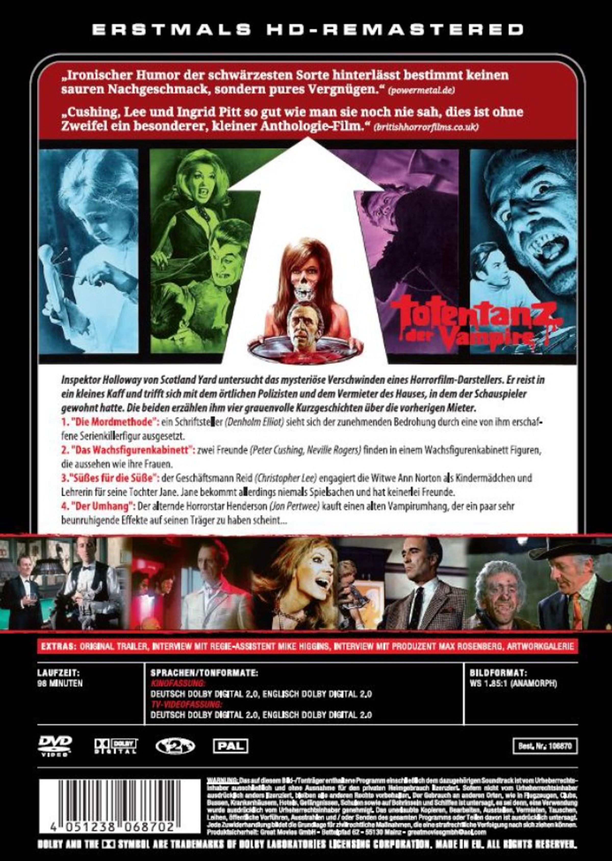 »Ironischer Humor der schwärzesten Sorte hinterlässt bestimmt keinen sauren Nachgeschmack, sondern pures Vergnügen.« (powermetal.de)»Cushing, Lee und Ingrid Pitt so gut wie man sie noch nie sah, dies ist ohne Zweifel ein besonderer, kleiner Anthologie-Film.« (britishhorrorfilms.co.uk)