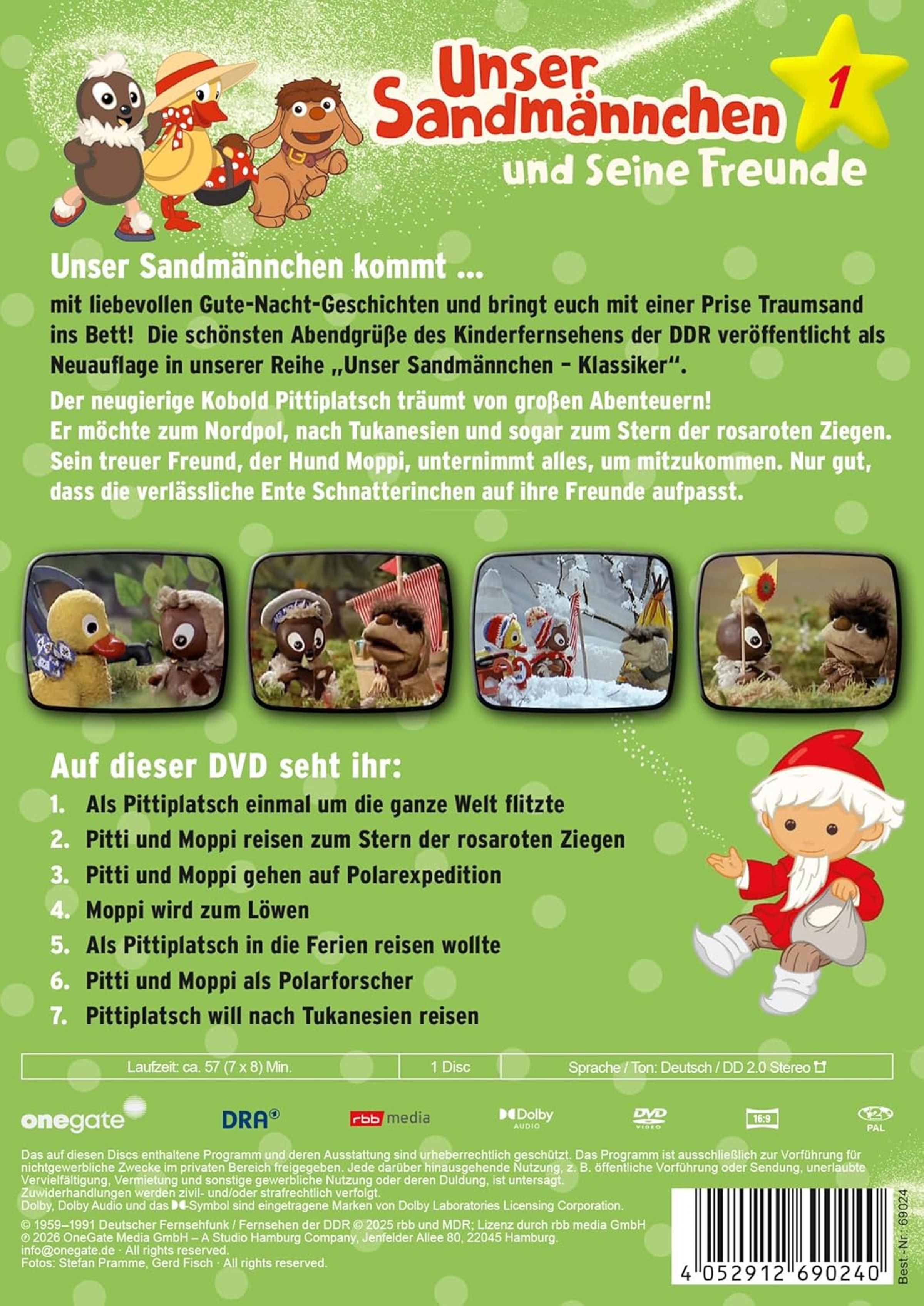 Unser Sandmännchen kommt mit liebevollen Gute-Nacht-Geschichten und bringt Kinder mit einer Prise Traumsand ins Bett! Die schönsten Abendgrüße des Kinderfernsehens der DDR rund um den lustigen Kobold Pittiplatsch, seinen treuen Freund Moppi und das Schnatterinchen nochmals veröffentlicht als Neuauflage der Reihe »Unser Sandmännchen - Klassiker« aus den Jahren 1959 - 1991.