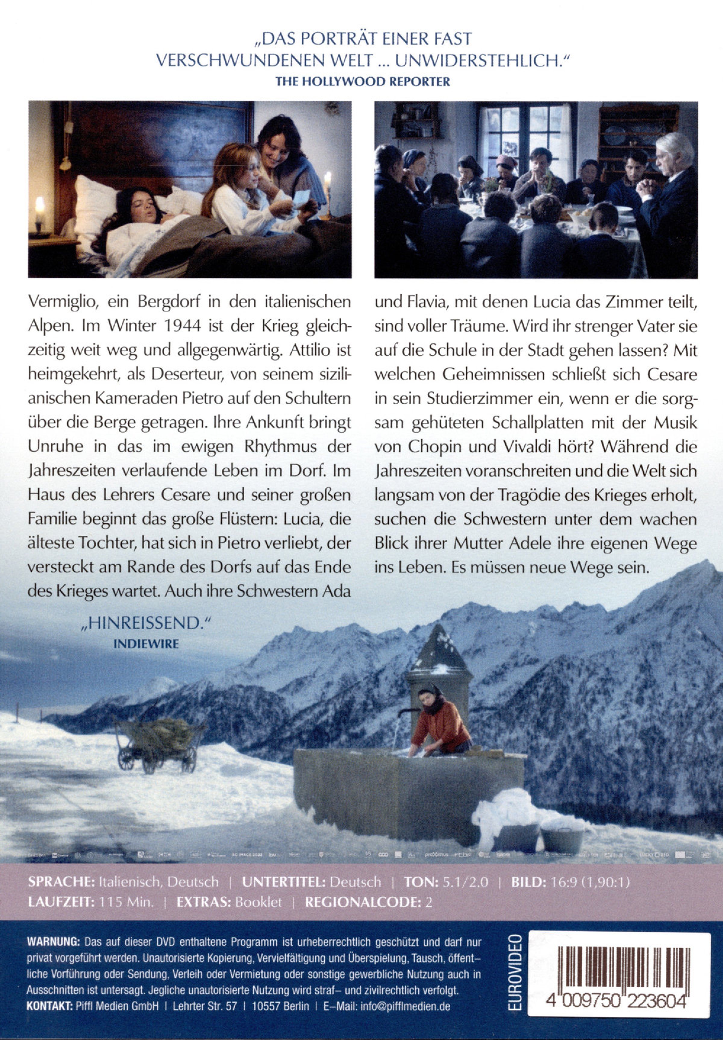 Vermiglio, ein Bergdorf in den italienischen Alpen. Im Winter 1944 ist der Krieg gleichzeitig weit weg und allgegenwärtig. Attilio ist heimgekehrt, als Deserteur, von seinem sizilianischen Kameraden Pietro auf den Schultern über die Berge getragen. Ihre Ankunft bringt Unruhe in das im ewigen Rhythmus der Jahreszeiten verlaufende Leben im Dorf. Im Haus des Lehrers Cesare und seiner großen Familie beginnt das große Flüstern: Lucia, die älteste Tochter, hat sich in Pietro verliebt, der versteckt am Rande des Dorfs auf das Ende des Krieges wartet. Auch ihre Schwestern Ada und Flavia, mit denen Lucia das Zimmer teilt, sind voller Träume. Wird ihr strenger Vater sie auf die Schule in der Stadt gehen lassen? Mit welchen Geheimnissen schließt sich Cesare in sein Studierzimmer ein, wenn er die sorgsam gehüteten Schallplatten mit der Musik von Chopin und Vivaldi hört? Während die Jahreszeiten voranschreiten und die Welt sich langsam von der Tragödie des Krieges erholt, suchen die Schwestern unter dem wachen Blick ihrer Mutter Adele ihre eigenen Wege ins Leben. Es müssen neue Wege sein.