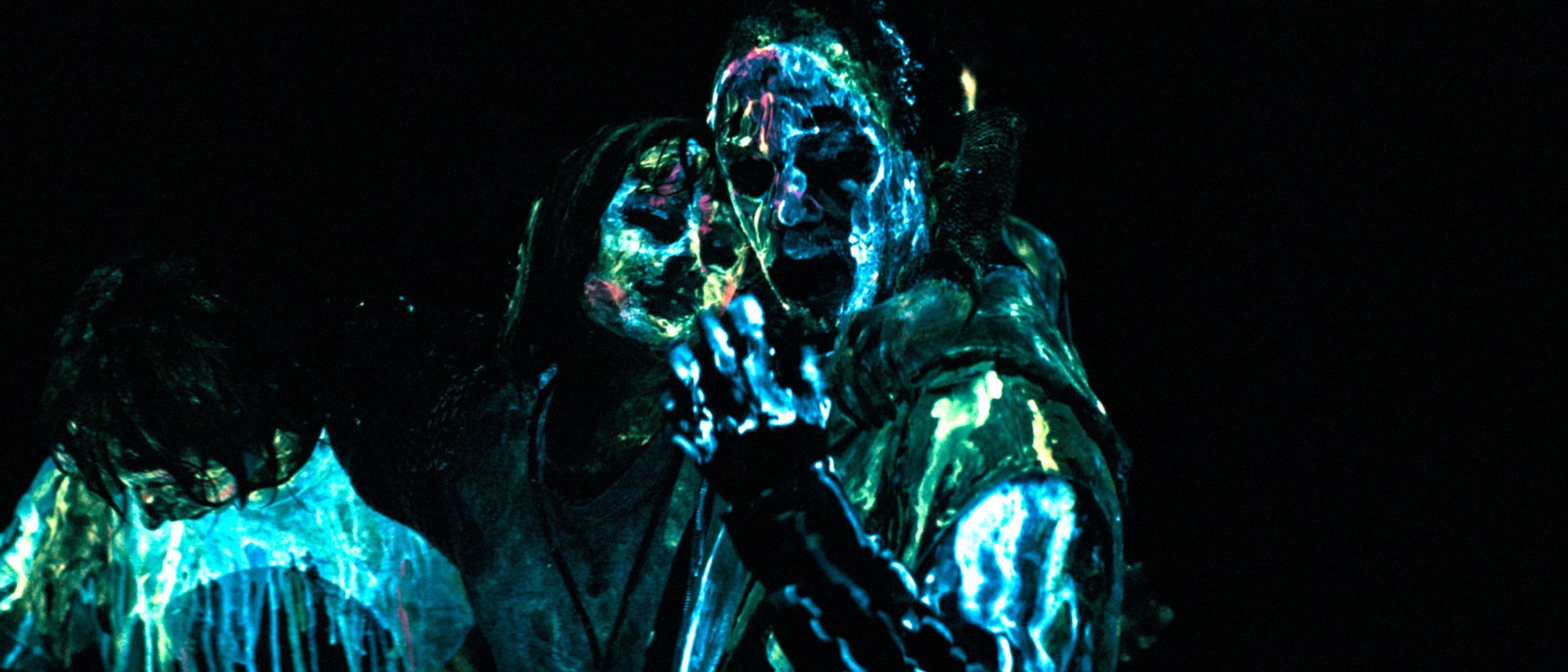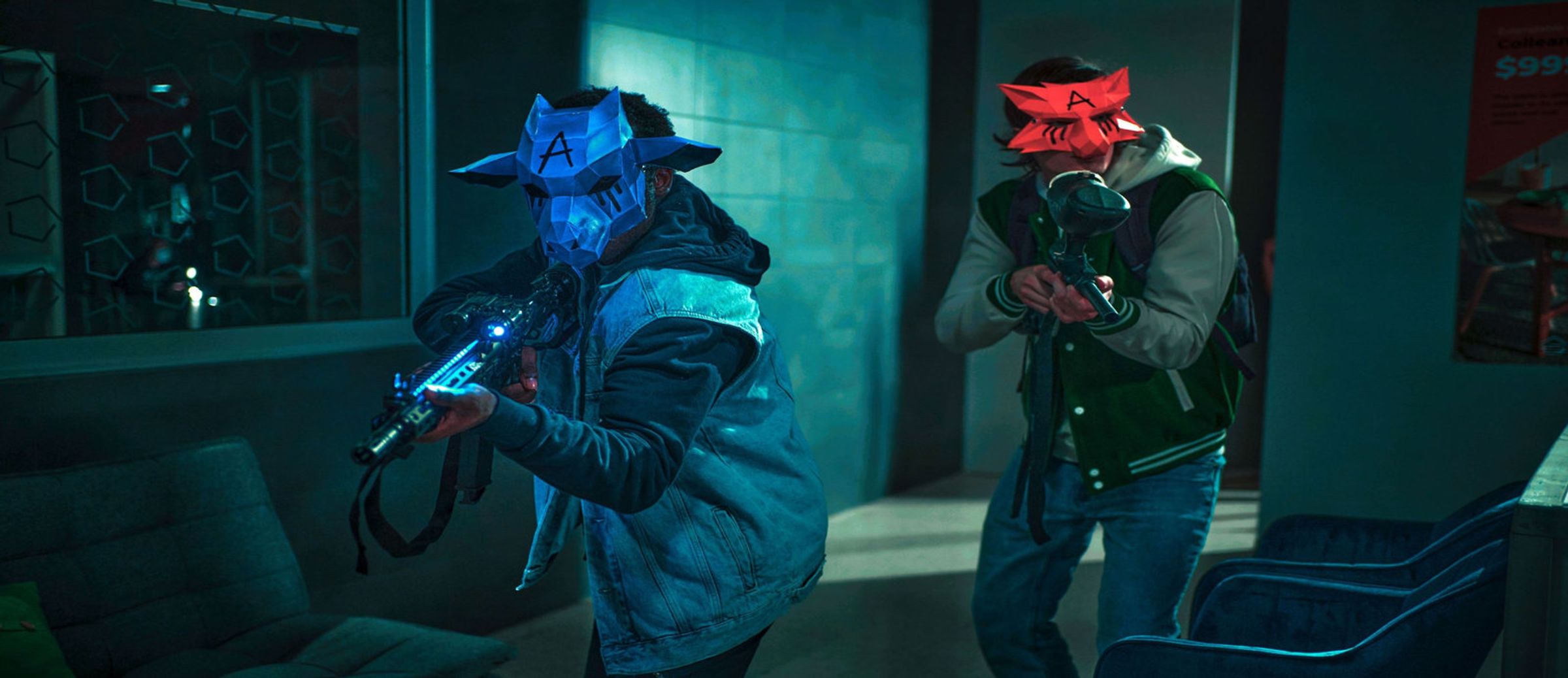 "Wake Up" in leuchtenden Lettern. Darunter bewaffnete Personen mit Tiermasken in einem Lagerhaus. Text: "Eine Nacht. Ein Fehler. Kein Entkommen.", Blu-ray Disc