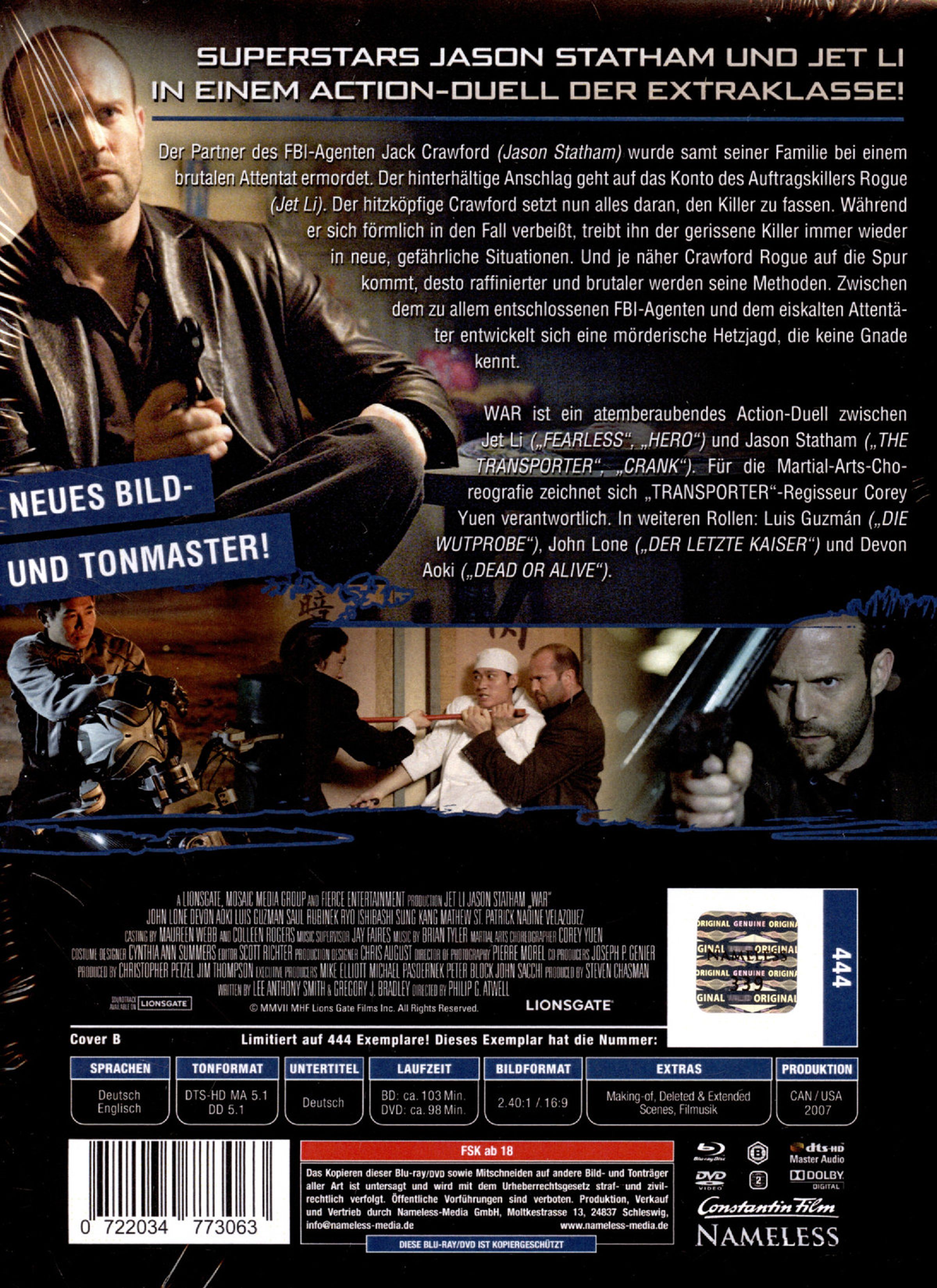 WAR ist ein atemberaubendes Action-Duell zwischen Jet Li und Jason Statham. Für die Martial-Arts-Choreografie zeichnet sich »TRANSPORTER«-Regisseur Corey Yuen verantwortlich.