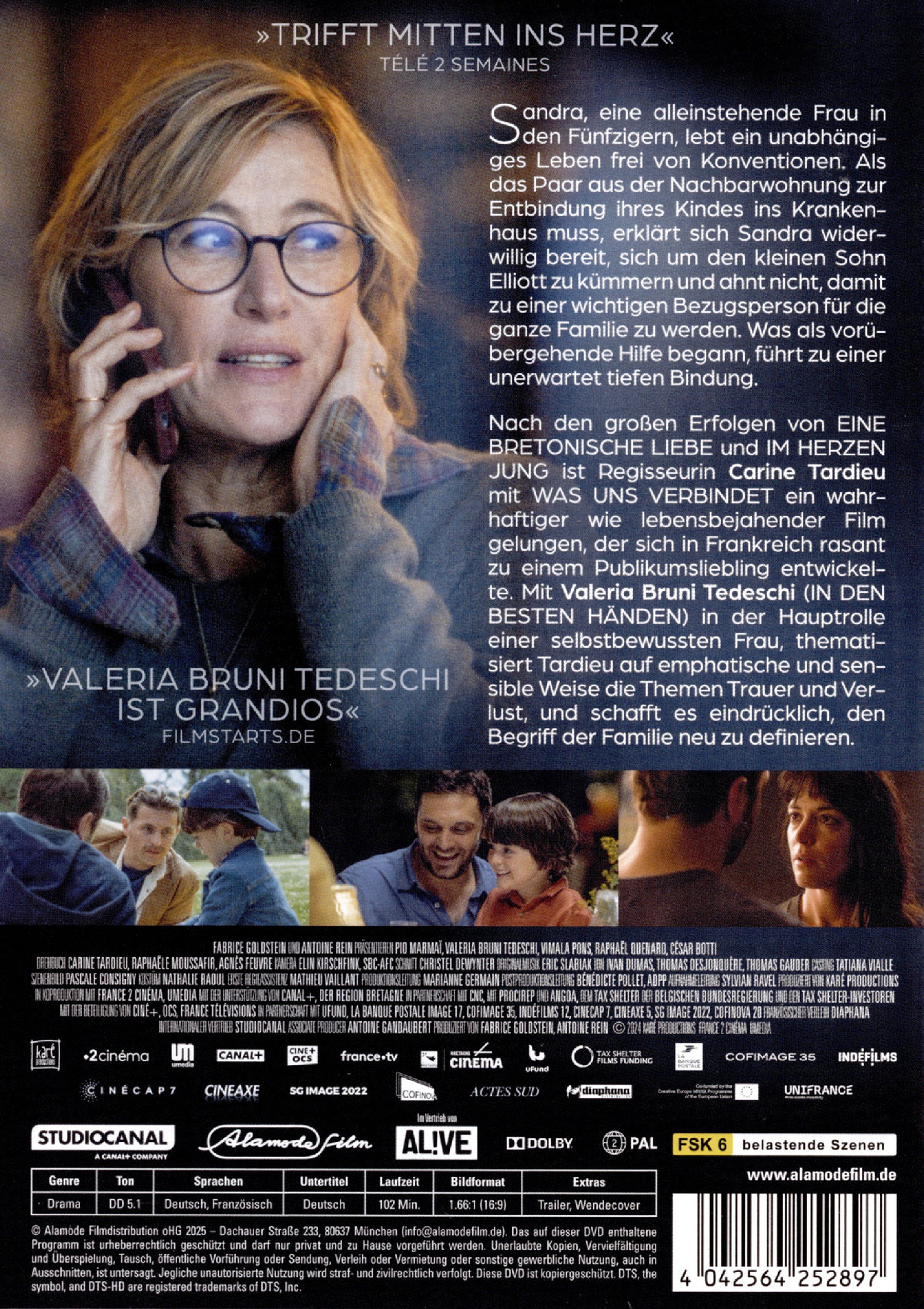 Nach den großen Erfolgen von »Eine bretonische Liebe« und »Im Herzen Jung« ist Regisseurin Carine Tardieu mit »Was uns verbindet« ein wahrhaftiger wie lebensbejahender Film gelungen, der sich in Frankreich rasant zu einem Publikumsliebling entwickelte. Mit Valeria Bruni Tedeschi in der Hauptrolle einer selbstbewussten, selbstbestimmten Frau in ihren Fünfzigern, thematisiert Tardieu auf emphatische und sensible Weise die Themen Trauer und Verlust, und schafft es eindrücklich, den Begriff der Familie neu zu definieren.