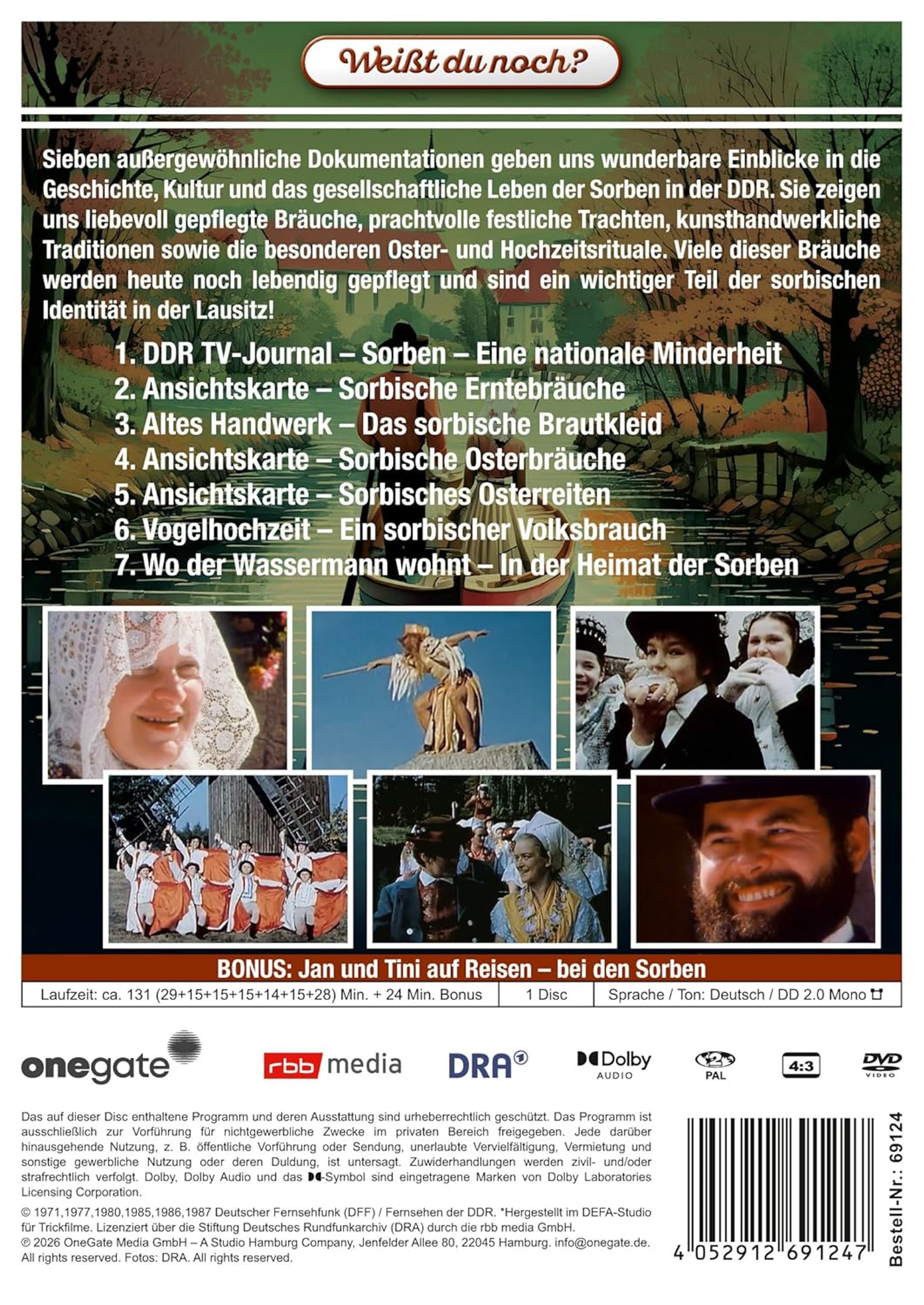Sechs außergewöhnliche Dokumentationen aus den Jahren 1971 bis 1987 geben uns wunderbare Einblicke in die Geschichte, Kultur und das gesellschaftliche Leben der Sorben in der DDR. Sie zeigen uns liebevoll gepflegte Bräuche, prachtvolle festliche Trachten, kunsthandwerkliche Traditionen sowie die besonderen Oster- und Hochzeitsrituale. Viele dieser Bräuche werden heute noch lebendig gepflegt und sind ein wichtiger Teil der sorbischen Identität in der Lausitz!