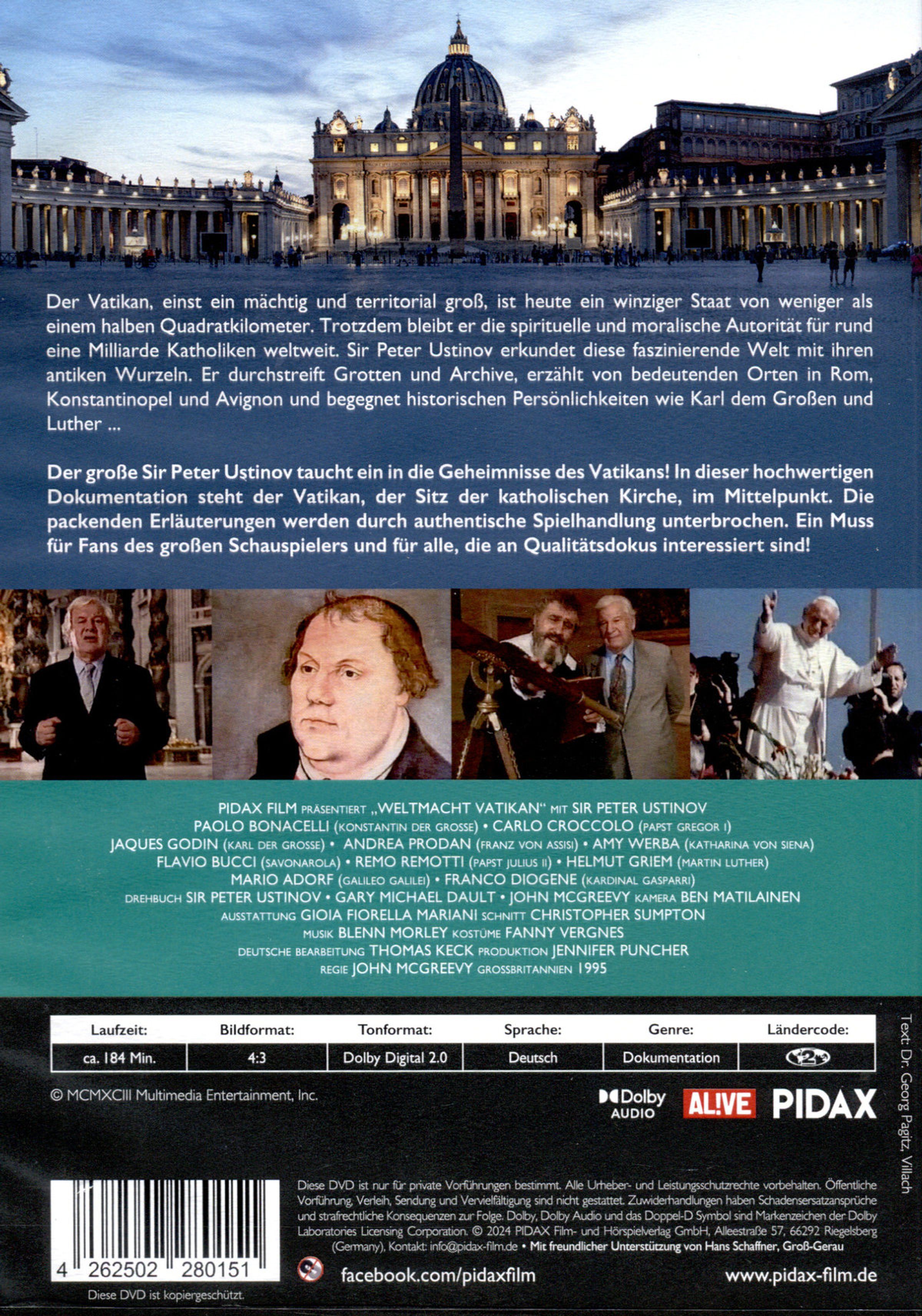 Text: "Weltmacht Vatikan", "Präsentiert von Sir Peter Ustinov". Ein Mann in Anzug sitzt vor der Kuppel des Petersdoms., 2 DVDs