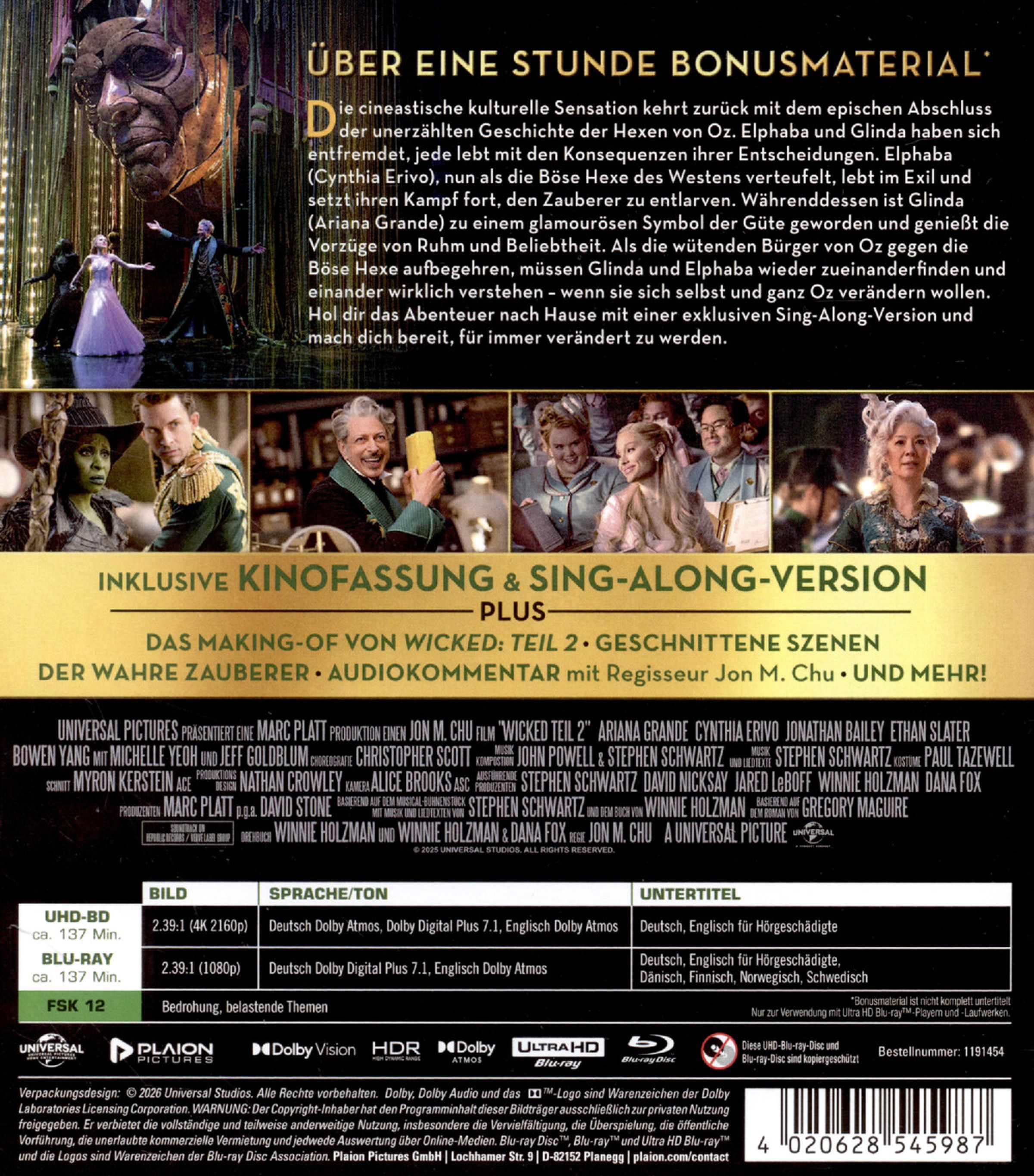 WICKED: TEIL 2 erzählt den Abschluss der unerzählten Geschichte der Hexen von Oz. Elphaba, als Böse Hexe des Westens verstoßen, kämpft im Exil für die Freiheit der Tiere und will die Wahrheit über den Zauberer enthüllen. Glinda, nun Symbol des Guten, genießt den Ruhm im Palast, leidet aber unter der Trennung von Elphaba. Während ihre geplante Hochzeit mit Fiyero naht, bedrohen Intrigen und ein Mädchen aus Kansas das fragile Gleichgewicht von Oz. Glinda und Elphaba müssen ein letztes Mal zusammenfinden, den ihre außergewöhnliche Freundschaft ist der Schlüssel zu ihrem Schicksal.