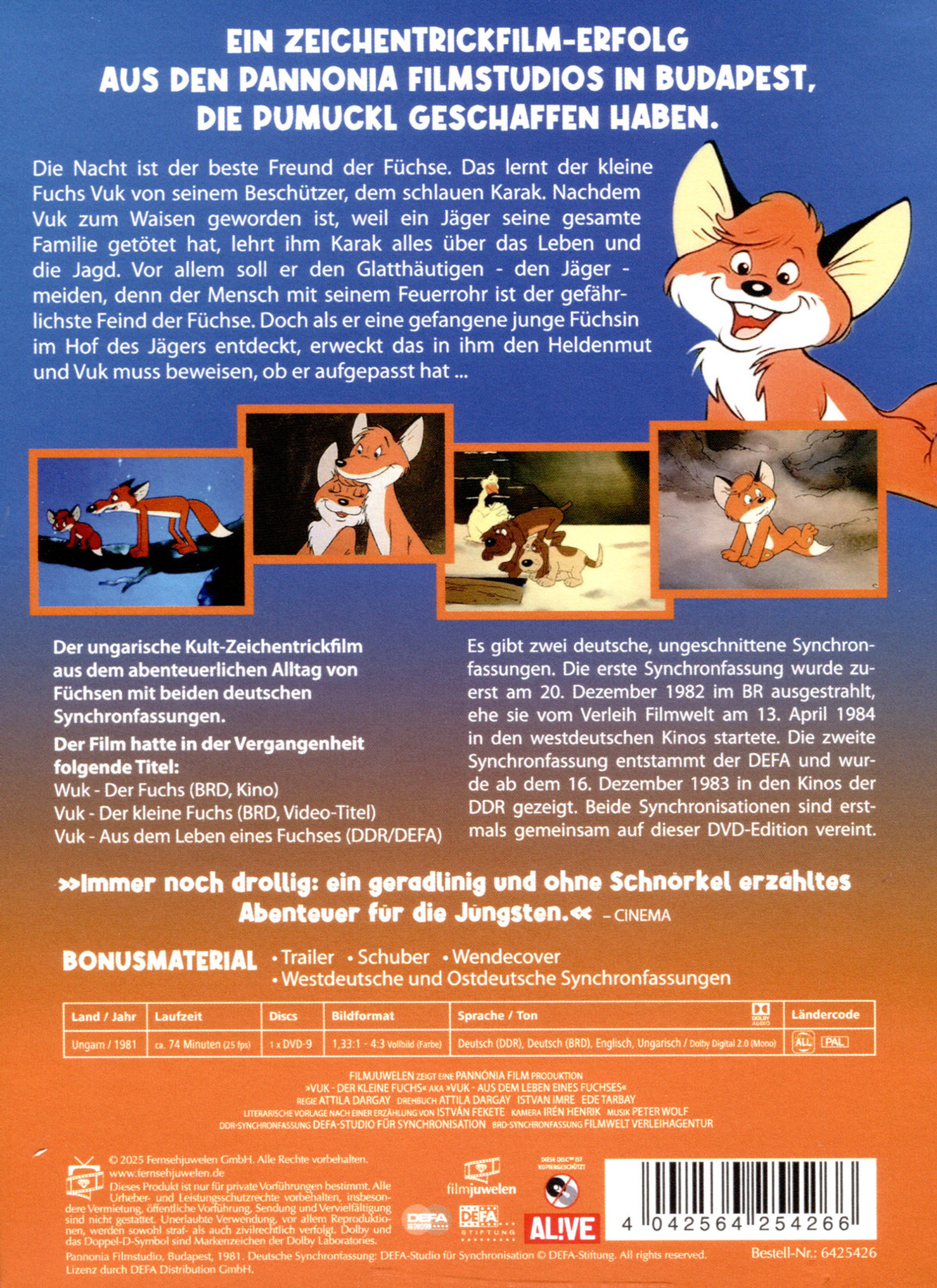 Beschützer, dem schlauen Karak. Nachdem Vuk zum Waisen geworden ist, weil ein Jäger seine gesamte Familie getötet hat, lehrt ihm Karak alles über das Leben und die Jagd. Vor allem soll er den Glatthäutigen - den Jäger - meiden, denn der Mensch mit seinem Feuerrohr ist der gefährlichste Feind der Füchse. Doch als er eine gefangene junge Füchsin im Hof des Jägers entdeckt, erweckt das in ihm den Heldenmut und Vuk muss beweisen, ob er aufgepasst hat ...